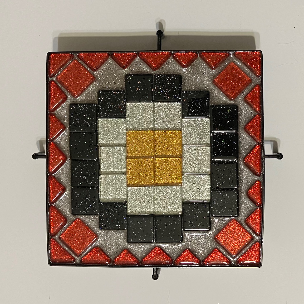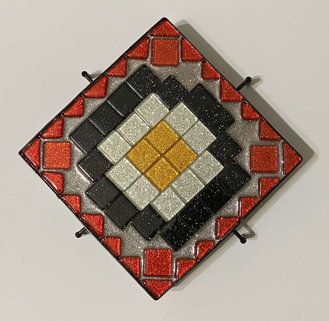 This 6″ handmade mosaic trivet (size not including the feet) is a must-have addition to your kitchen and home décor. The beautiful multicolor design is perfect for all occasions and is sure to impress your guests. Made with glittery glass tiles and resin, this square trivet features a stunning target pattern of red, black, silver and gold tiles that is sure to catch the eye. Ideal for use as a hotplate or decorative piece, this Loris1ofakindart trivet is both functional and unique. Measuring 6″ in length and width and 1″ in height, it is lightweight (11.9 oz.) and easy to handle. Manufactured in 2024, this trivet is of high quality and is made to last.