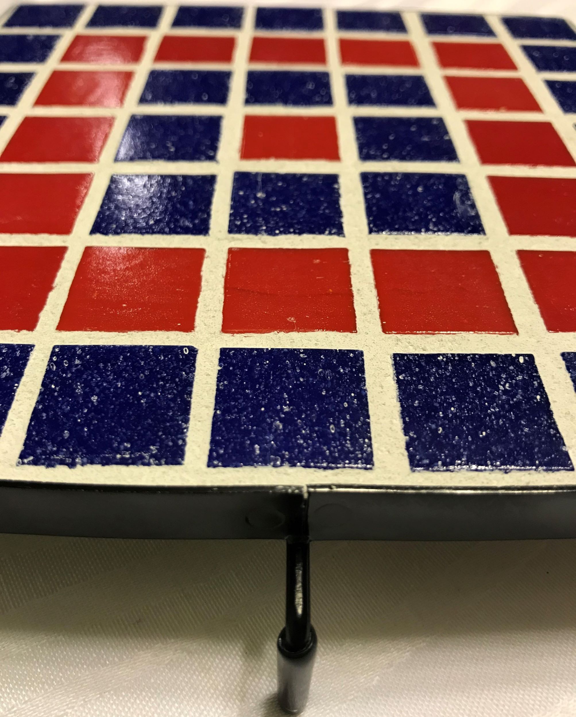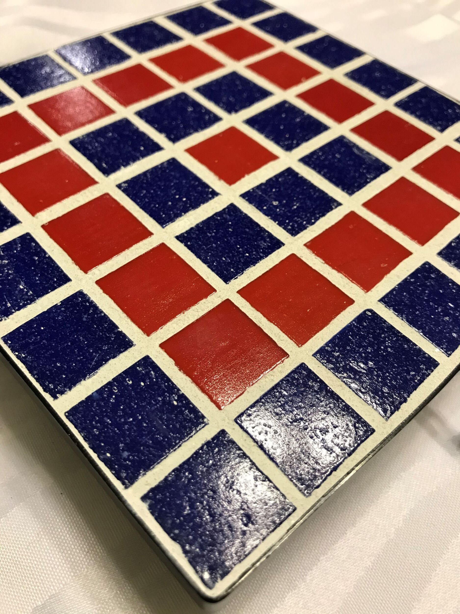 - It is a 6″ square and diagonally it is 8.5” – Red & Blue glass tiles with White grout and permanent rubber feet.