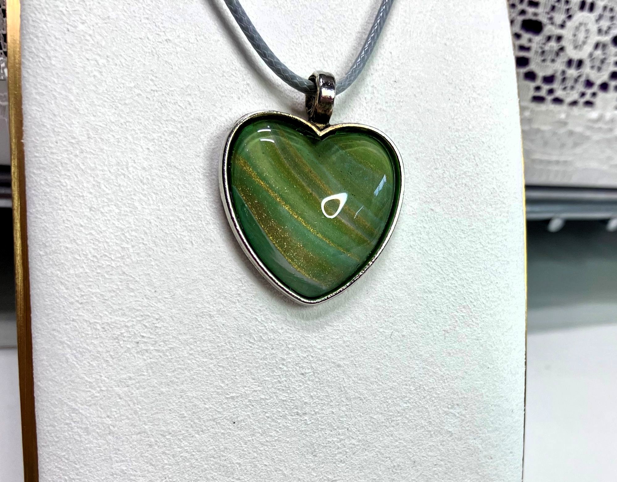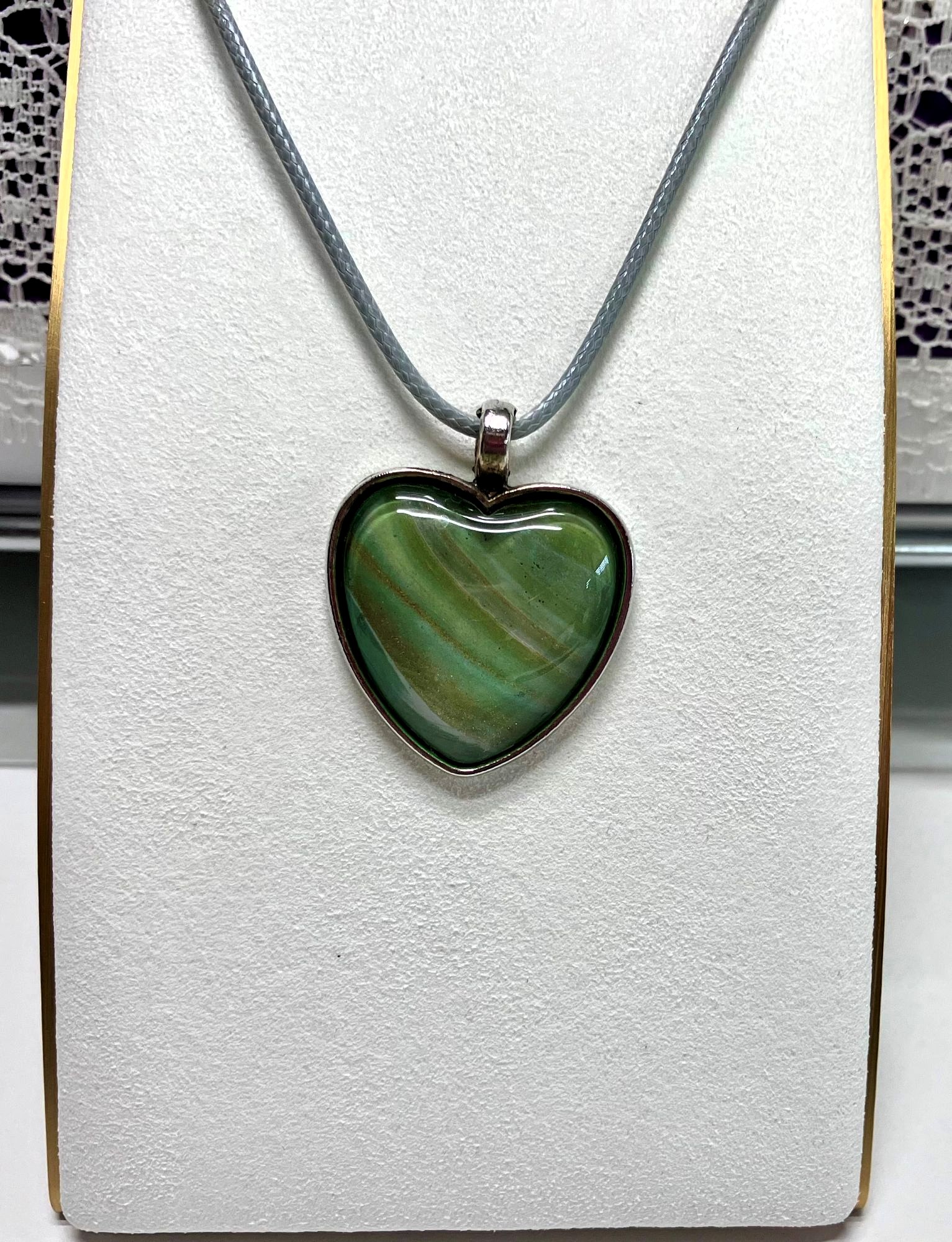 Express your unique style with this one-of-a-kind pendant necklace. The pendant features a heart shape with stunning fluid art in assortment of colors. It comes with an 18″ matching cord with a 2″ extension and a lobster clasp closure for a secure fit. The pendant necklace is made of surgical steel and silver. This necklace is handmade and perfect for those who love art-inspired jewelry.
