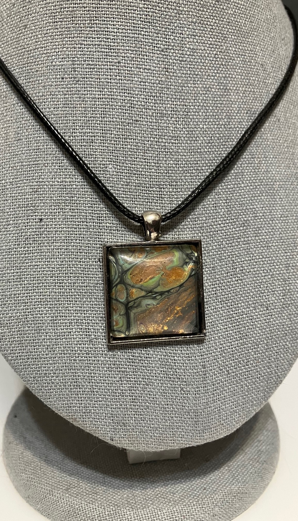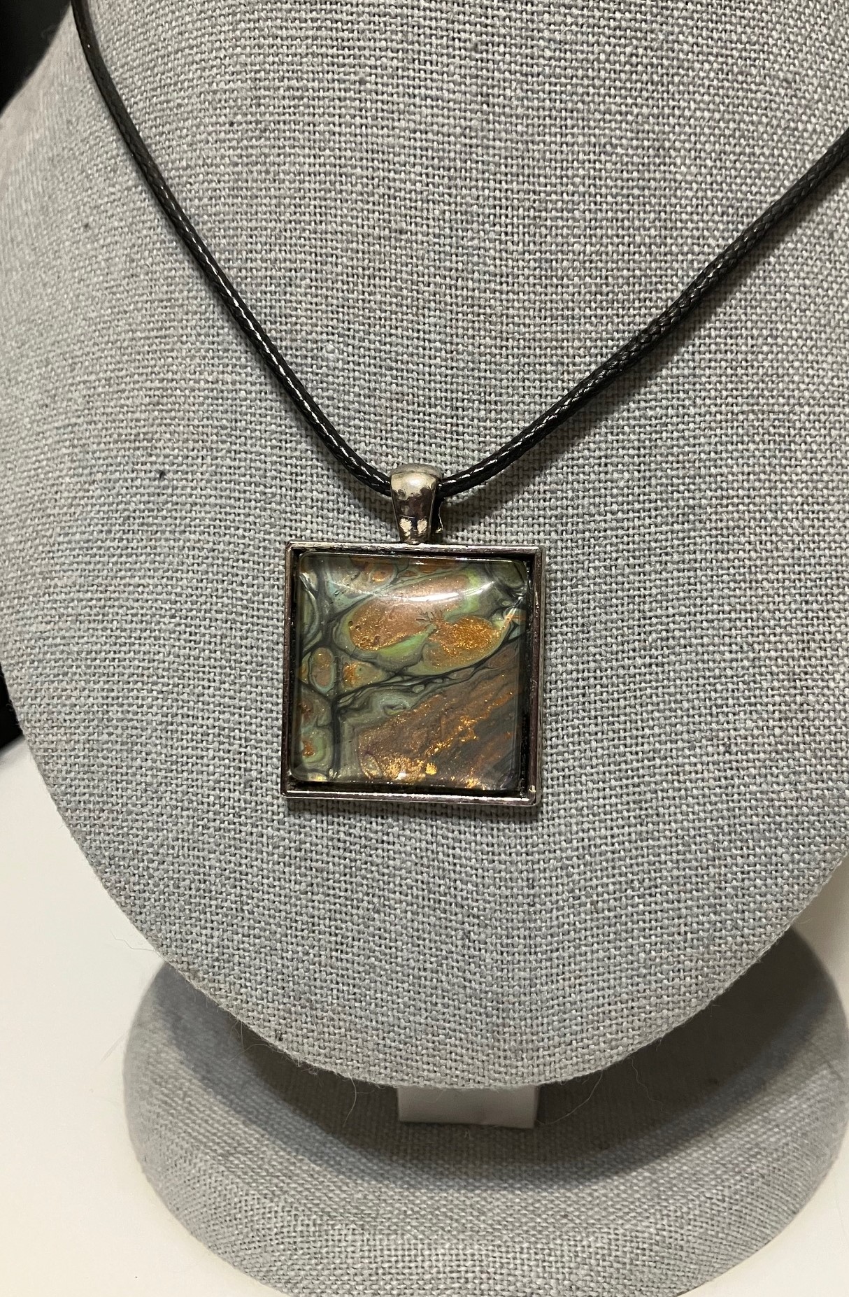 Black, Copper, Gray & Light Green Fluid Art Pendant Necklace, 1OAKG