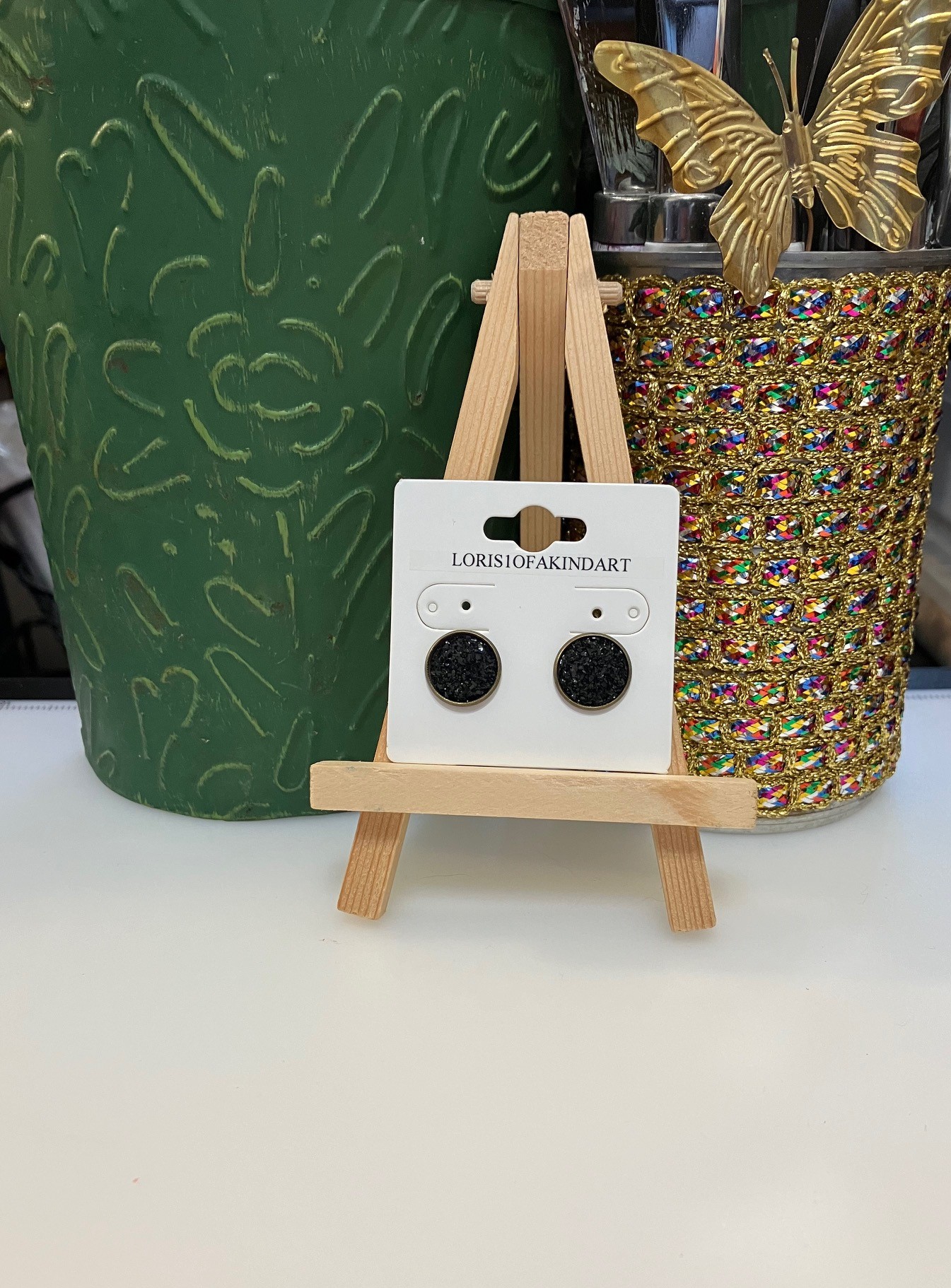 Add a pop of color and simplicity to your outfit with these stunning black druzy earrings! Measuring at 12mm in diameter, these round studs are made with resin and set in a bronze bezel. The silicone closure ensures a comfortable fit on your earlobe. The shiny black color of the main stone is eye-catching and sparkles with every movement, adding a touch of beauty to your overall look. These earrings are handcrafted by Loris1ofakindart and are perfect for those with sensitive ears as they are hypoallergenic and made with stainless steel as the base metal. These earrings are perfect for any occasion, whether it’s a day out running errands or a formal event.