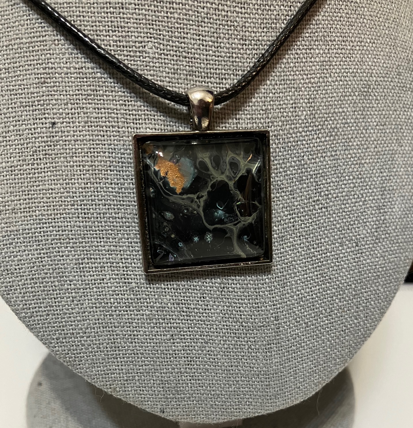 Express your unique style with this one-of-a-kind pendant necklace. The pendant features a square shape with stunning fluid art in black, gray, copper & blue hues. It comes with an 18″ black cord with a 2″ extension and a lobster clasp closure for a secure fit. The pendant is made of surgical steel and silver bezel-set to enhance its beauty. This necklace is handmade and perfect for those who love art-inspired jewelry.
