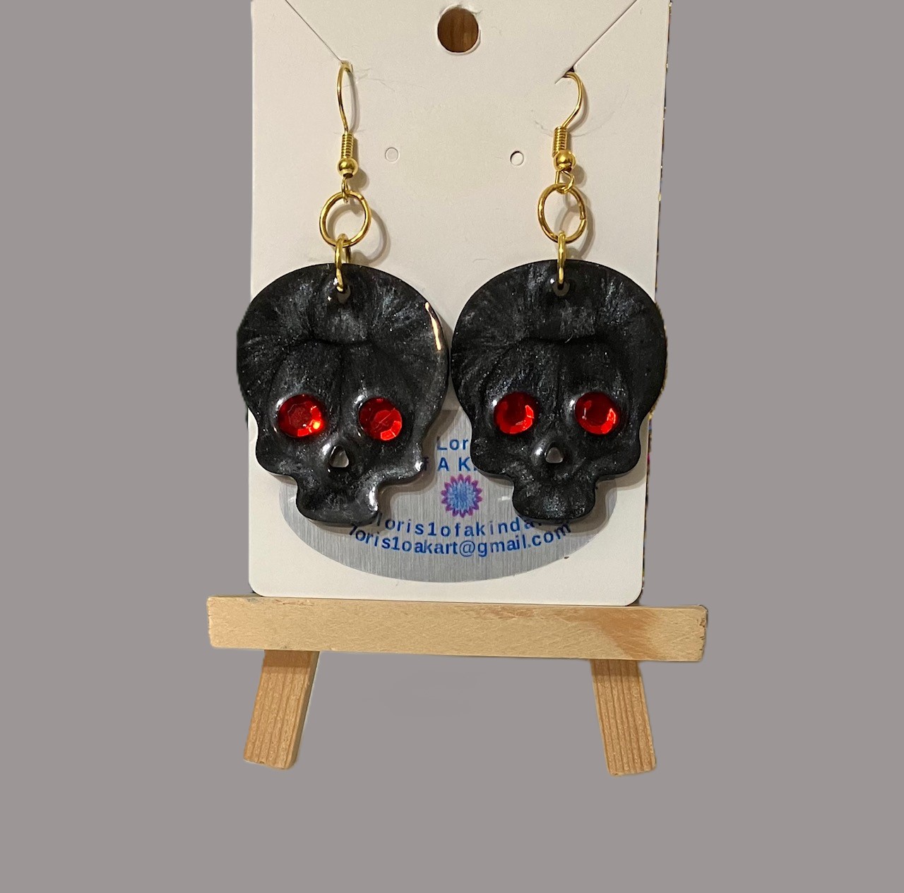 Black Skull with Red Crystal Eyes Dangling Resin Earrings, 1OAKG