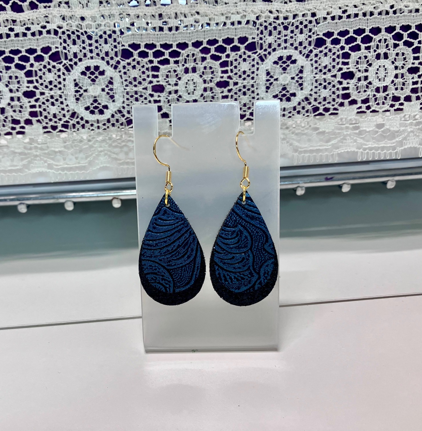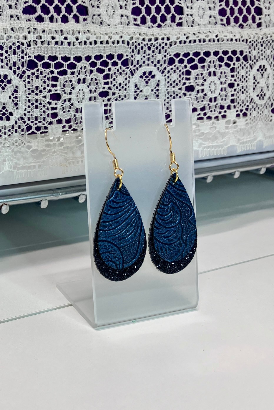 Blue Embossed and Black Glitter Faux Leather Double-layered Dangle Earrings, 1OAKG