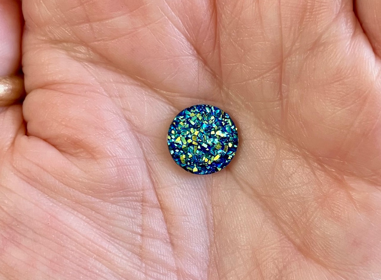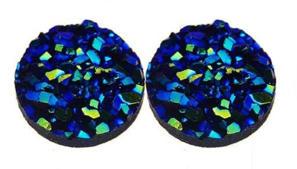 Add a pop of color and simplicity to your outfit with these stunning blue-multi druzy earrings! Measuring at 12mm in diameter, these round studs are made with resin and set in a bronze bezel. The silicone closure ensures a comfortable fit on your earlobe. The shiny blue-multi color of the main stone is eye-catching and sparkles with every movement, adding a touch of beauty to your overall look. These earrings are handcrafted by Loris1ofakindart and are perfect for those with sensitive ears as they are hypoallergenic and made with stainless steel as the base metal. These earrings are perfect for any occasion, whether it’s a day out running errands or a formal event.