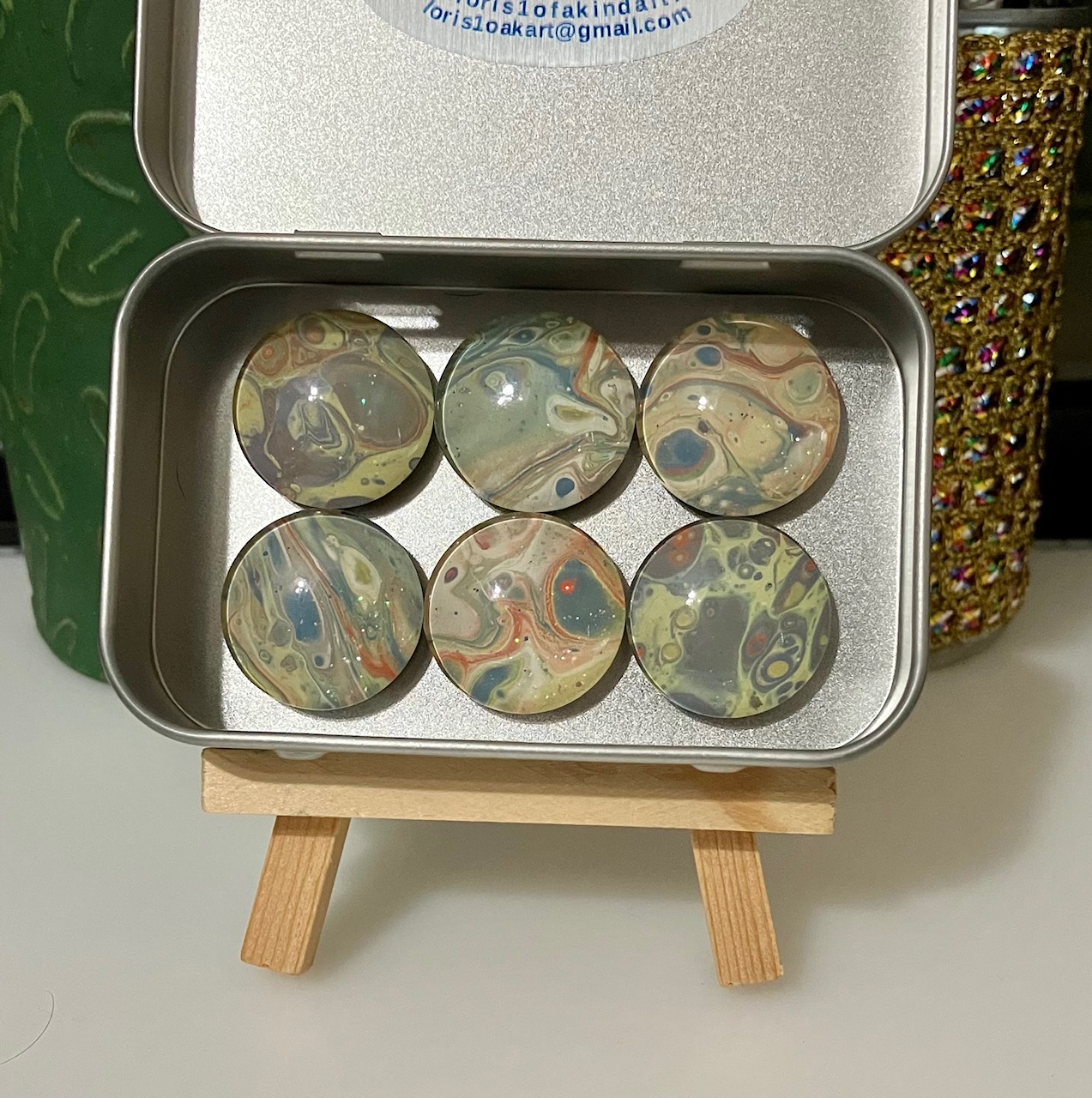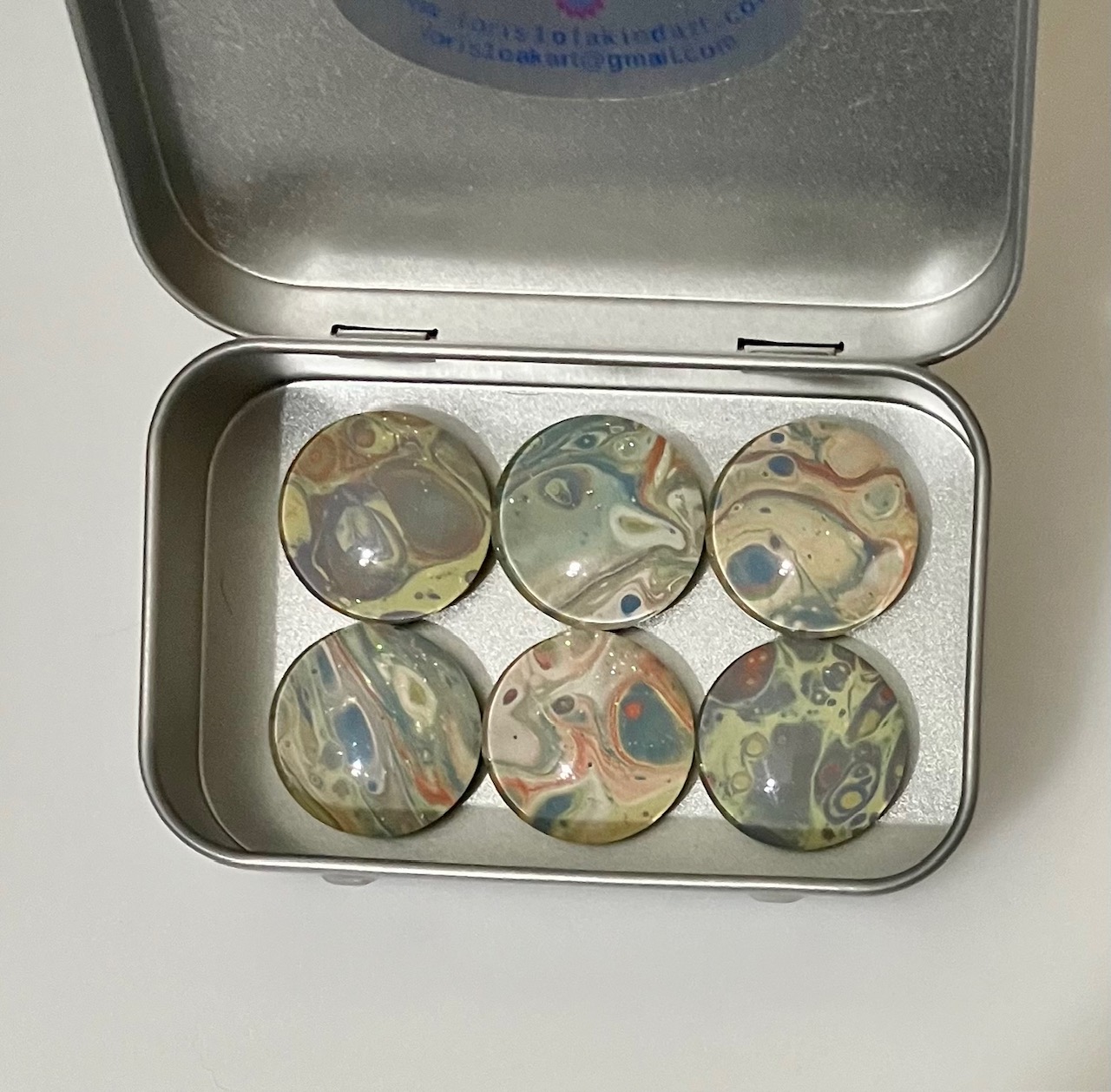 This item is a set of 6 acrylic pour refrigerator magnets. They are 1 inch (25mm) in diameter. They’re very strong magnets. One of these magnets will easily hold several sheets of paper by itself. They’re a perfect unique gift for anyone in your life or for yourself as they are all one of a kind pieces of art!  I make these magnets from the dried paint off of my acrylic pour paintings so the colors will be an assortment and they are stunning in person. The photos don’t do them any justice.