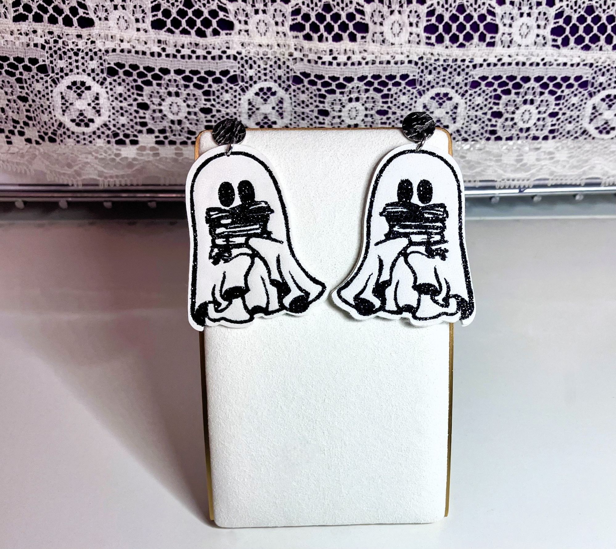 Add a touch of style to your Halloween wardrobe with these handmade faux leather ghost holding books dangle earrings. The earrings feature a single-layered design with faux leather & glittery HTV on both sides, making them a much more sturdy feel. The flat textured posts are stainless steel and come with a stainless steel post and back closure, making them comfortable to wear all day long. These post dangle earrings are lightweight and really perfect with your Halloween costume. They are approximately 2.5″ in length by 1.5” in width and the post size is .39in (10mm). This pair of earrings would be a great addition to your Halloween jewelry collection.