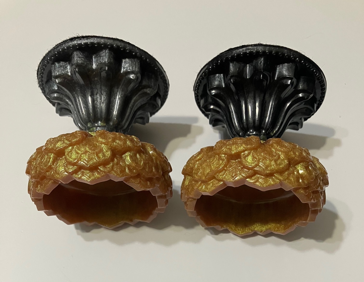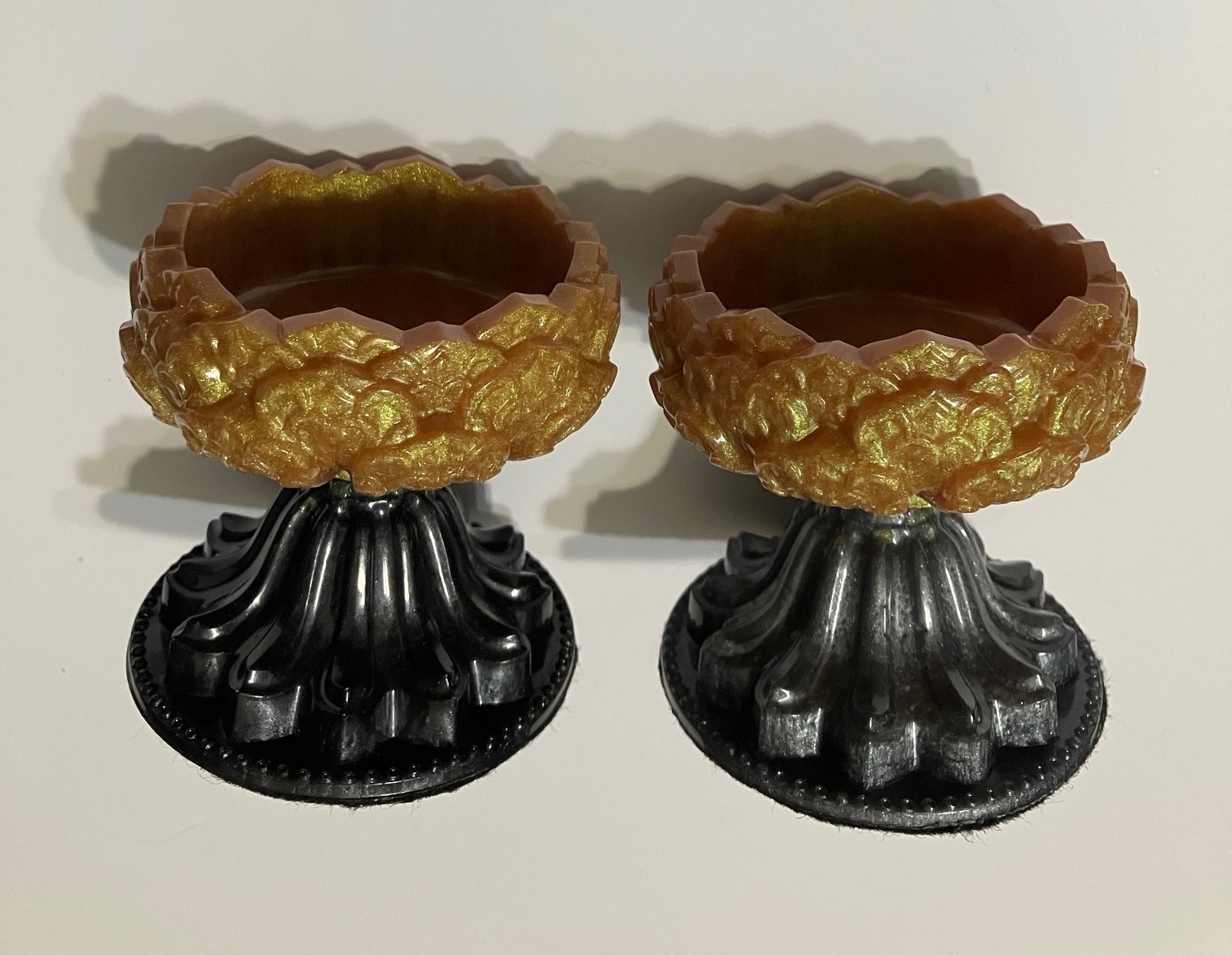 - These beautiful tea light holders have a Lotus flower like pattern. The top parts are chameleon gold. One of the bases is dark silver and the other one is black.