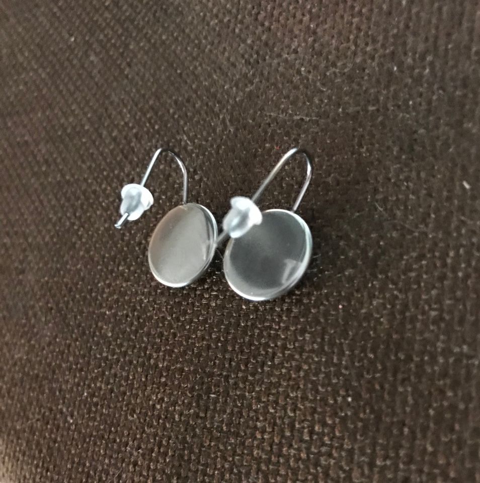- Materials: glitter, 12mm glass cabochon protector, stainless steel wire hook, rubber security backing.