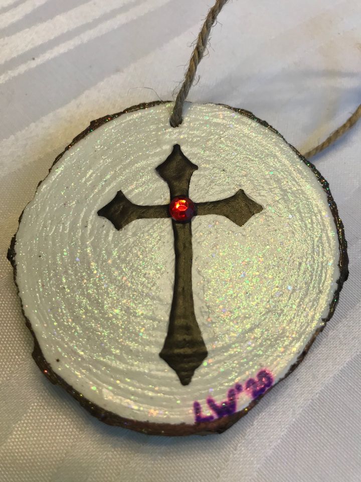Each wood slice, when finished, is very similarly hand painted, sealed and unique with knots, outer wood and between 2.5 and 3.5 inches in size. The pictures on the listing is what they will all pretty much look like. Your ornament will hang from a natural jute string.