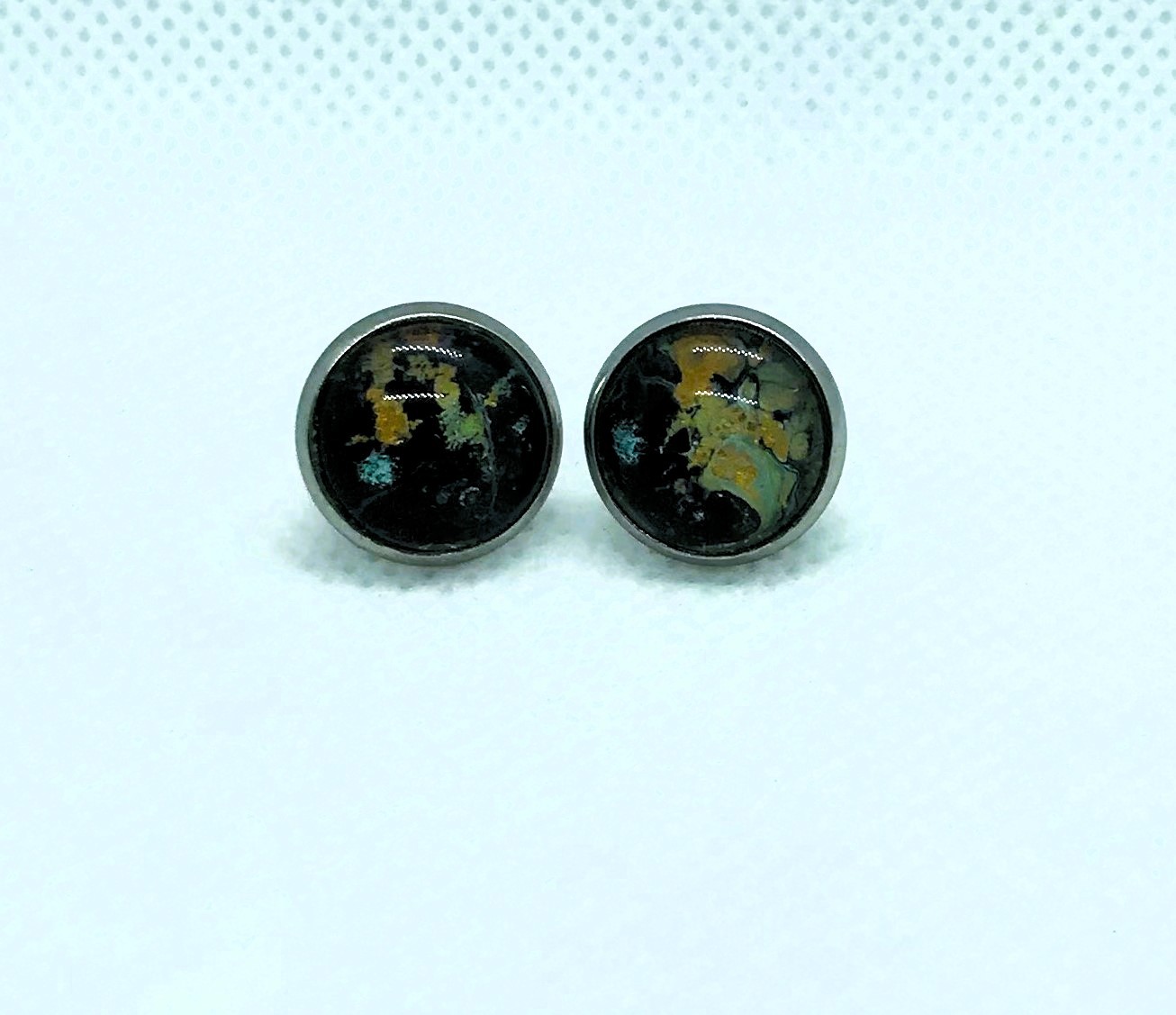 - Materials: fluid acrylic paint, glass cabochon protector, all stainless steel parts.