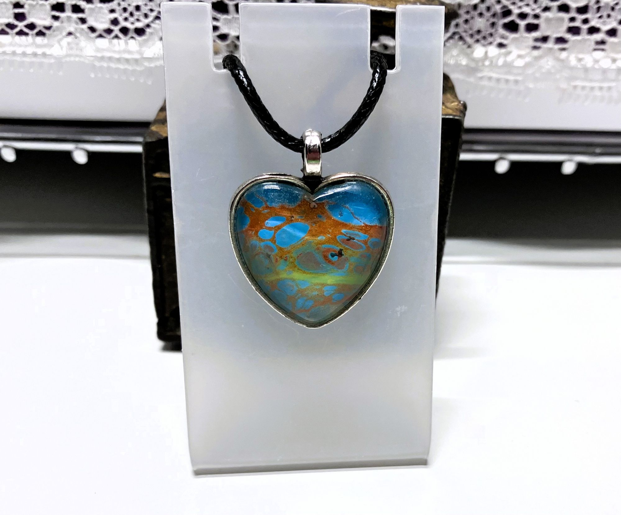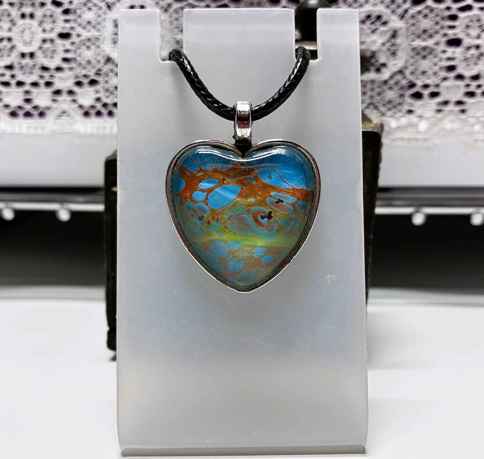 Express your unique style with this one-of-a-kind pendant necklace. The pendant features a heart shape with stunning fluid art in assortment of colors. It comes with an 18″ matching cord with a 2″ extension and a lobster clasp closure for a secure fit. The pendant necklace is made of surgical steel and silver. This necklace is handmade and perfect for those who love art-inspired jewelry.
