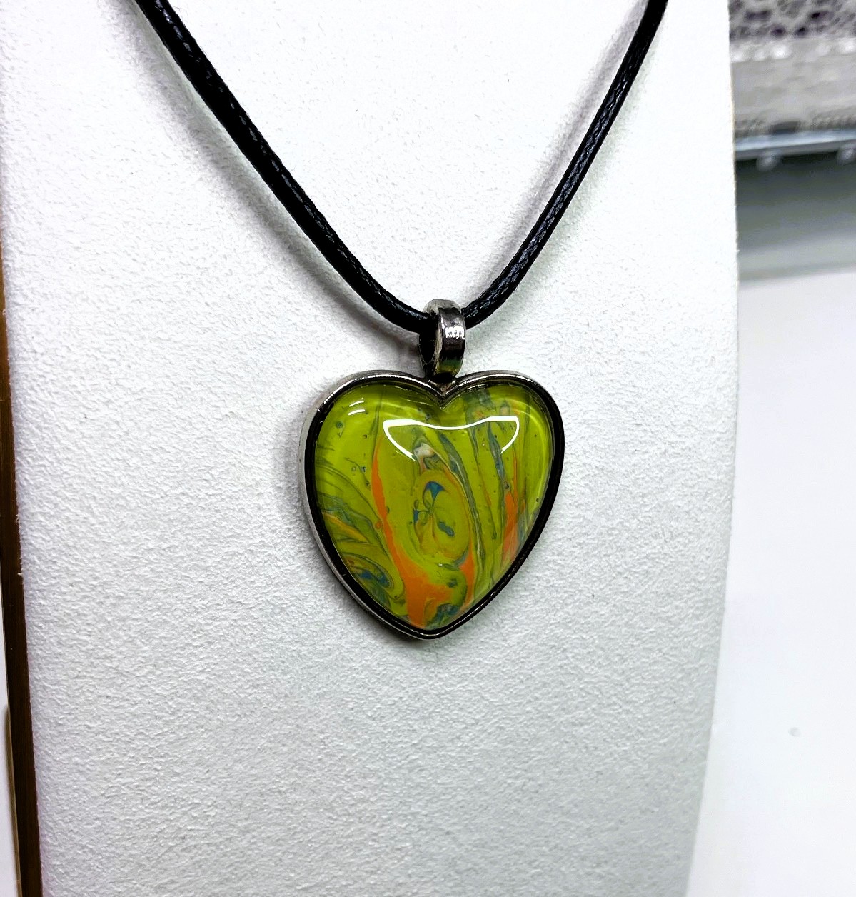 Express your unique style with this one-of-a-kind pendant necklace. The pendant features a heart shape with stunning fluid art in assortment of colors. It comes with an 18″ matching cord with a 2″ extension and a lobster clasp closure for a secure fit. The pendant necklace is made of surgical steel and silver. This necklace is handmade and perfect for those who love art-inspired jewelry.