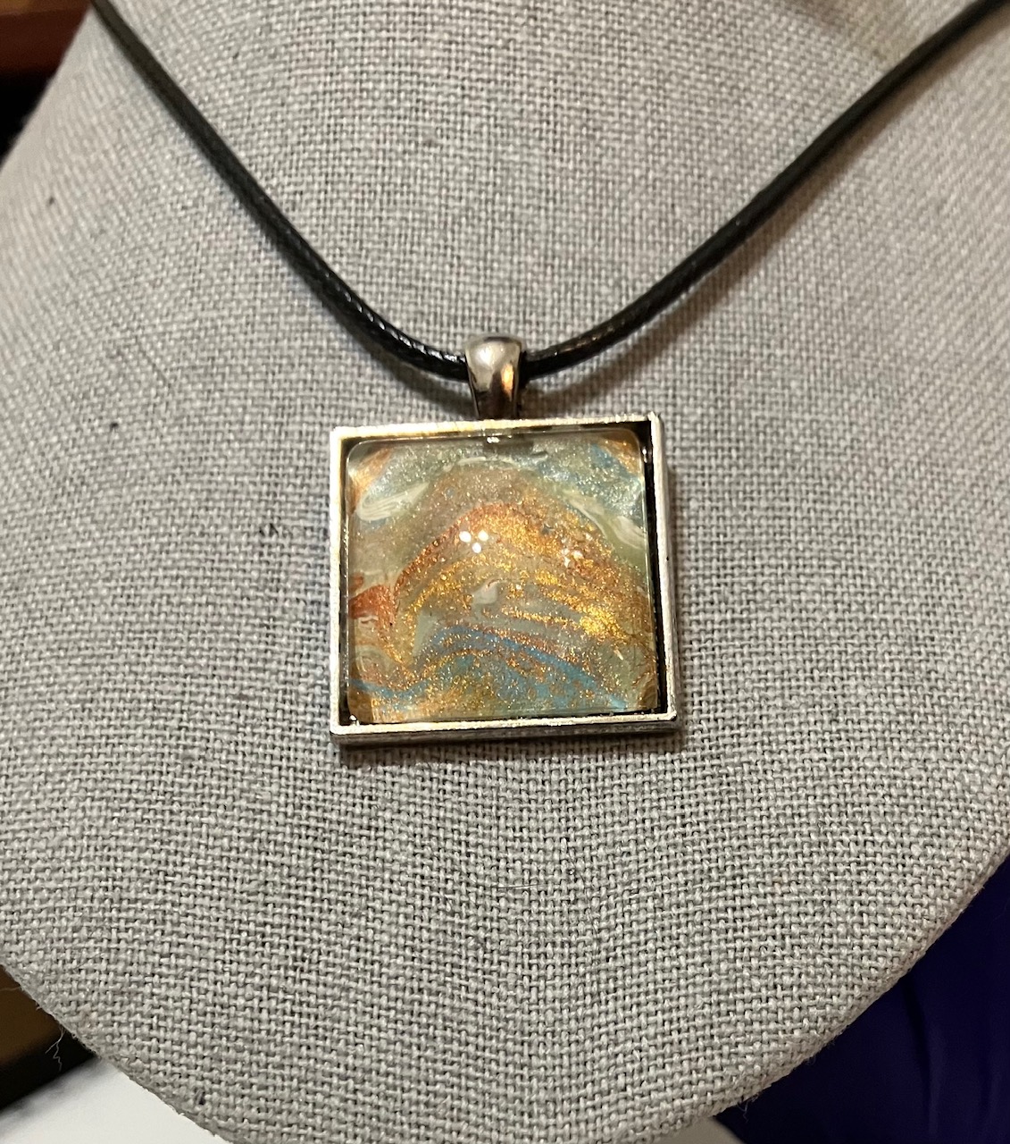 Express your unique style with this one-of-a-kind pendant necklace. The pendant features a square shape with stunning fluid art in gold, copper, silver & turquoise hues. It comes with an 18″ black cord with a 2″ extension and a lobster clasp closure for a secure fit. The pendant is made of surgical steel and silver bezel-set to enhance its beauty. This necklace is handmade and perfect for those who love art-inspired jewelry. It looks different in each angle.