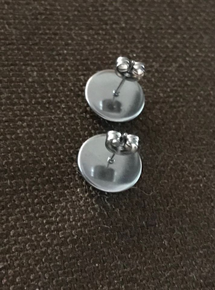 - Materials: glitter, glass cabochon protector, stainless steel posts and backing.