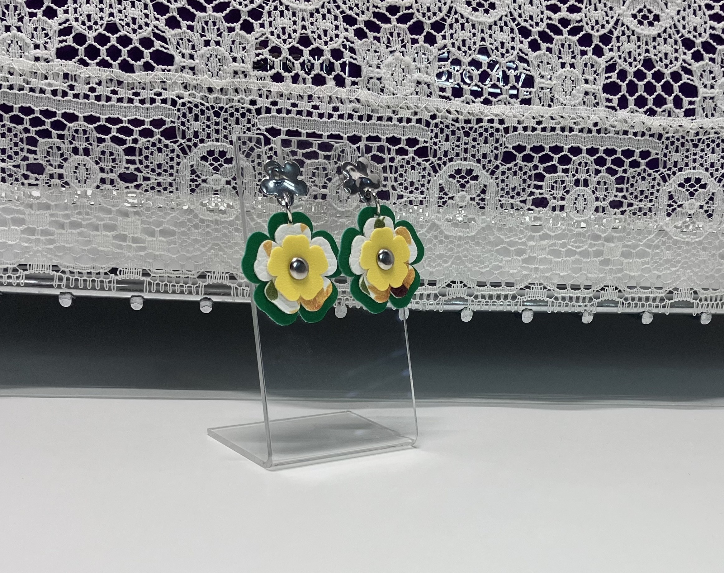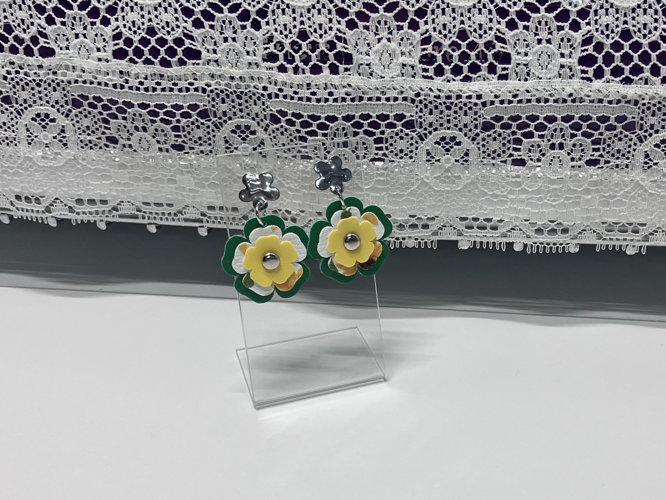 Green, White and Yellow Triple-Layered Flower Dangle Earrings, 1OAKG