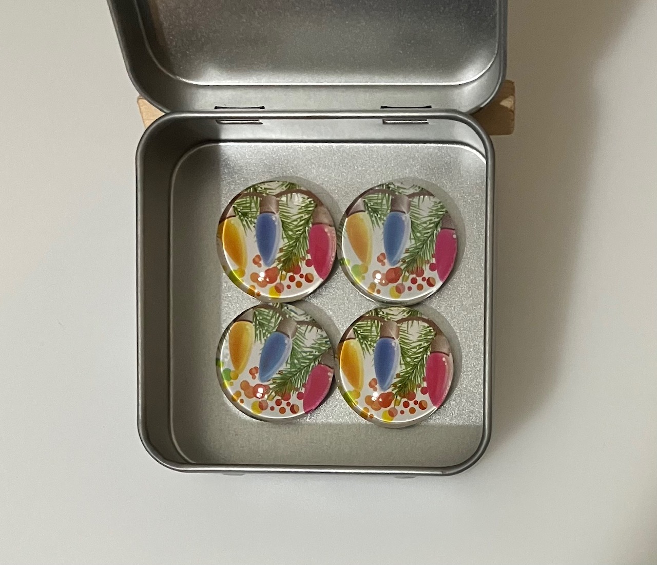 This item is a set of 4 refrigerator magnets. They are 1 inch (25mm) in diameter. They’re very strong magnets. One of these magnets will easily hold several sheets of paper by itself. They’re a perfect unique gift for anyone or just for yourself!