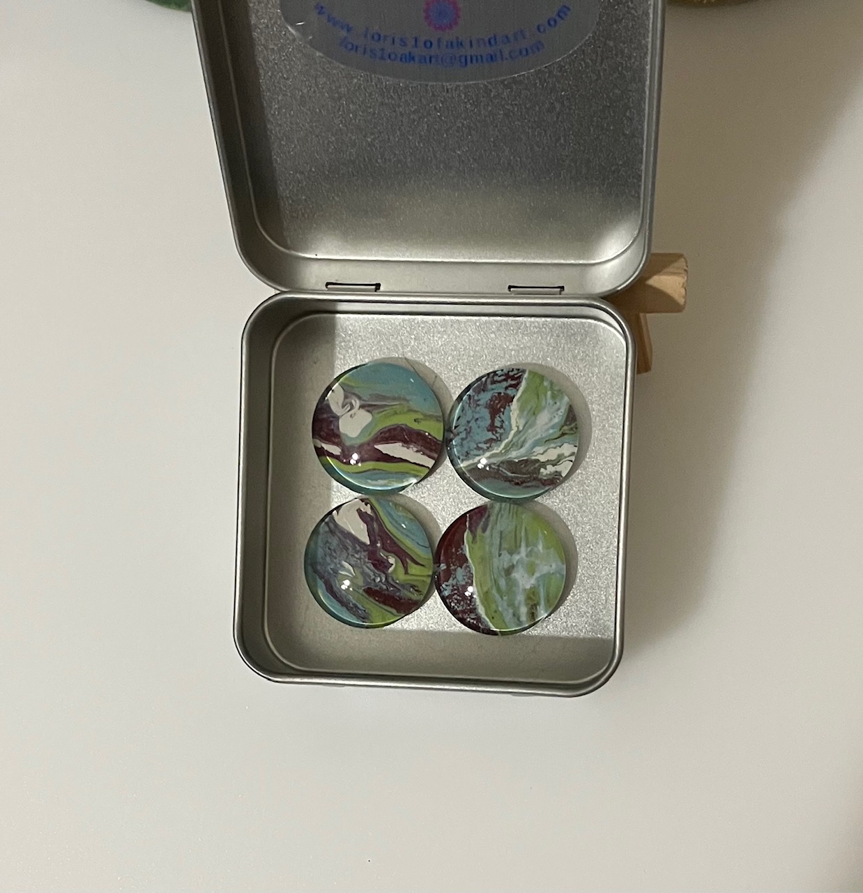 This item is a set of 4 acrylic pour refrigerator magnets. They are 1 inch (25mm) in diameter. They’re very strong magnets. One of these magnets will easily hold several sheets of paper by itself. They’re a perfect unique gift for anyone or just for yourself as they are all one of a kind pieces of art!  I make these magnets from the dried paint off of my acrylic pour paintings so the colors will be an assortment and they are stunning in person. The photos don’t do them any justice.