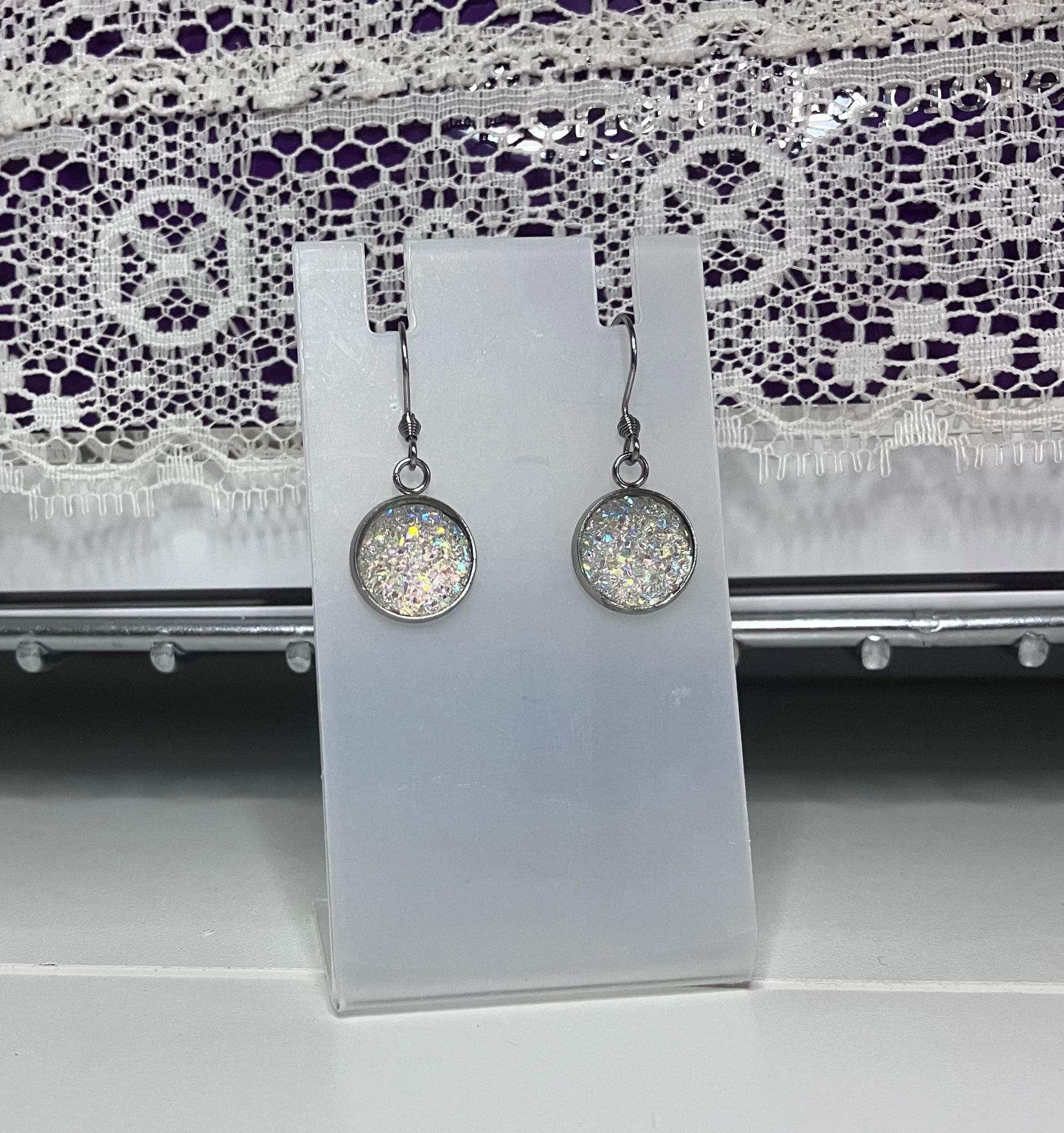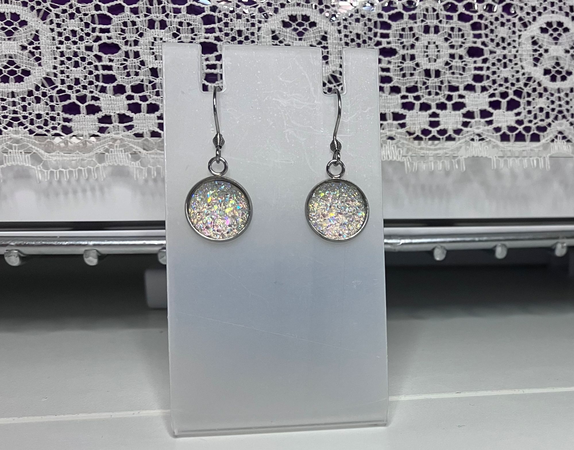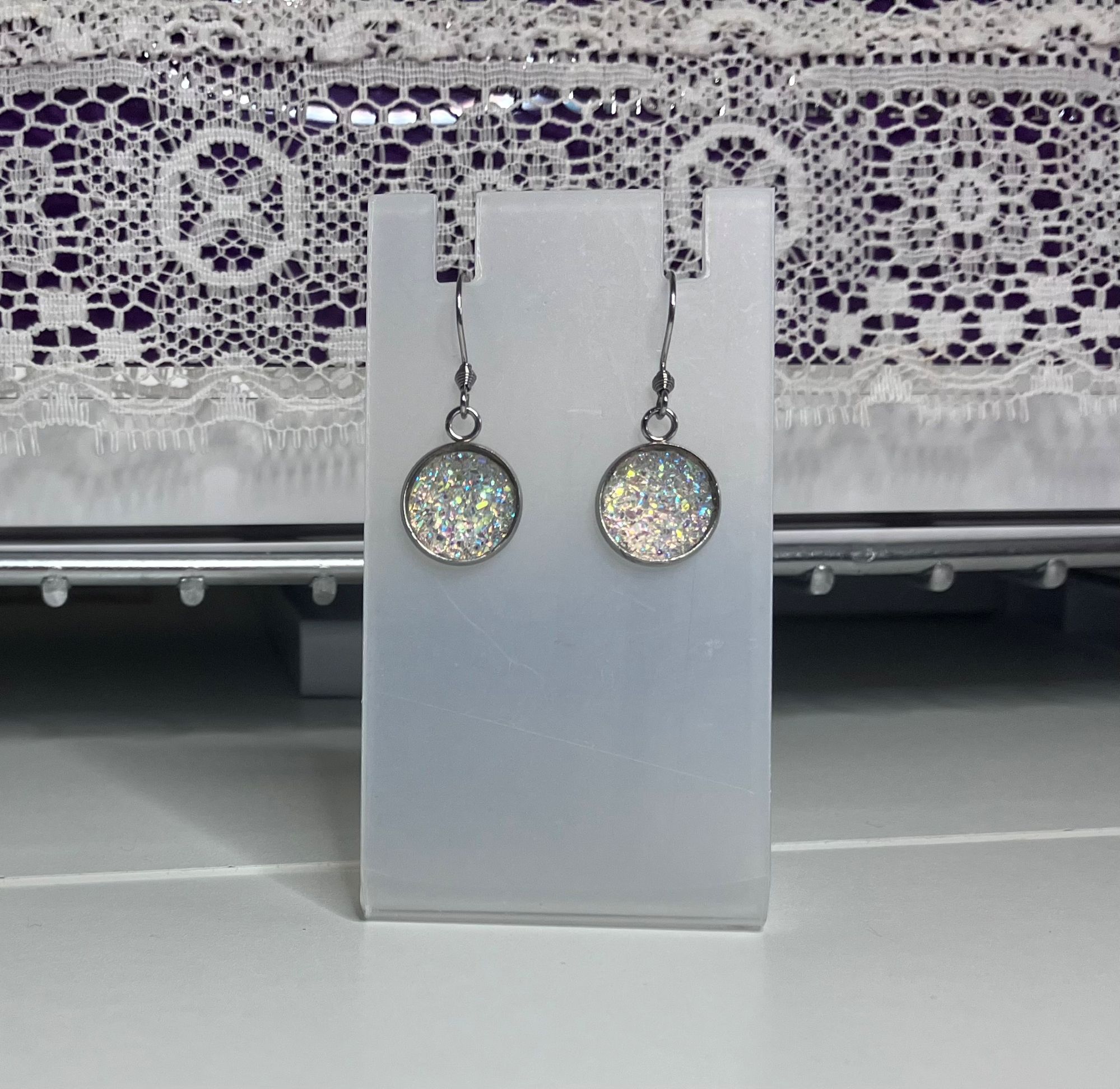 Nice earring for dress or casual wear. Earrings feature faux druzy cabochons in a stainless steel setting.