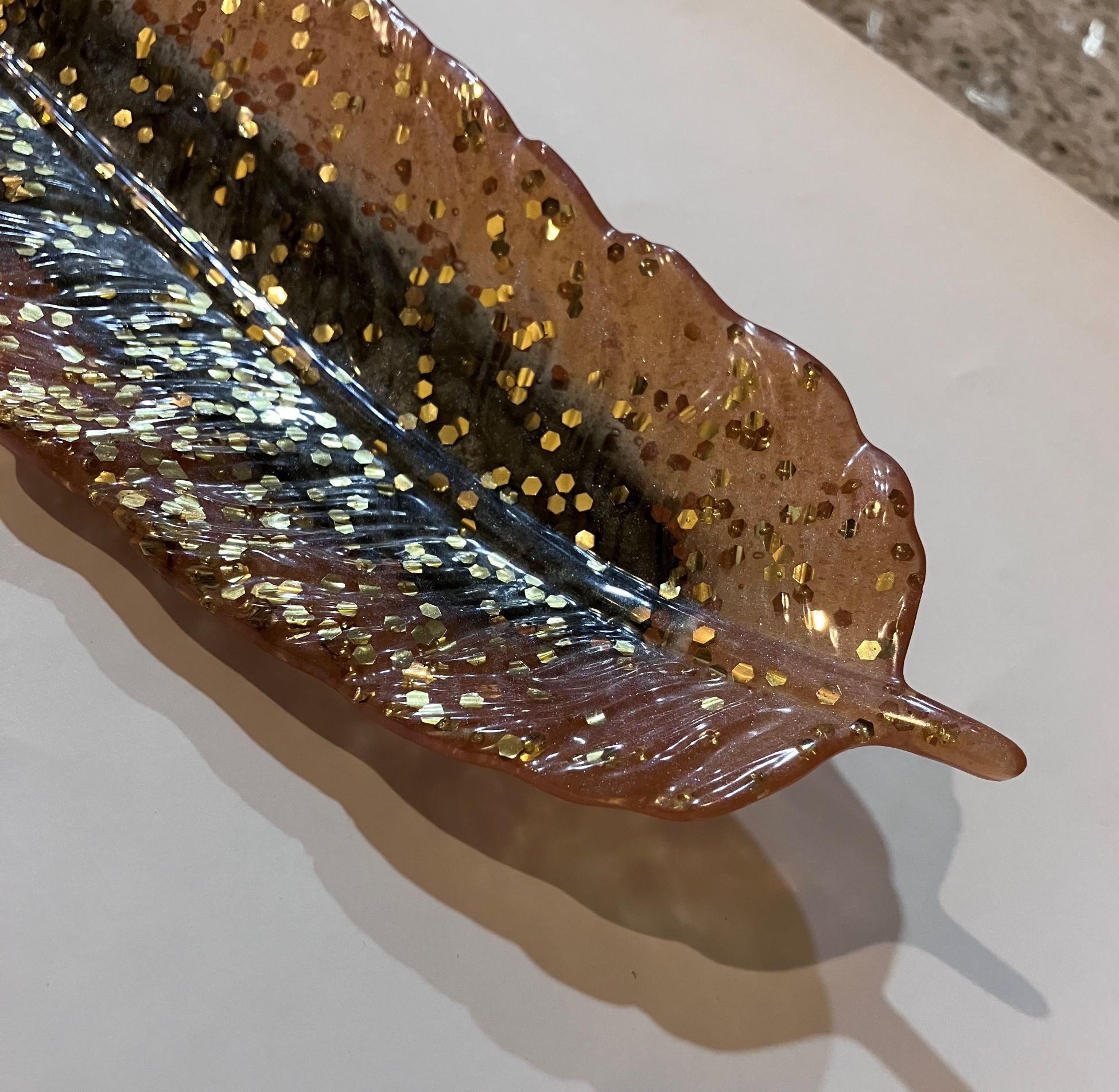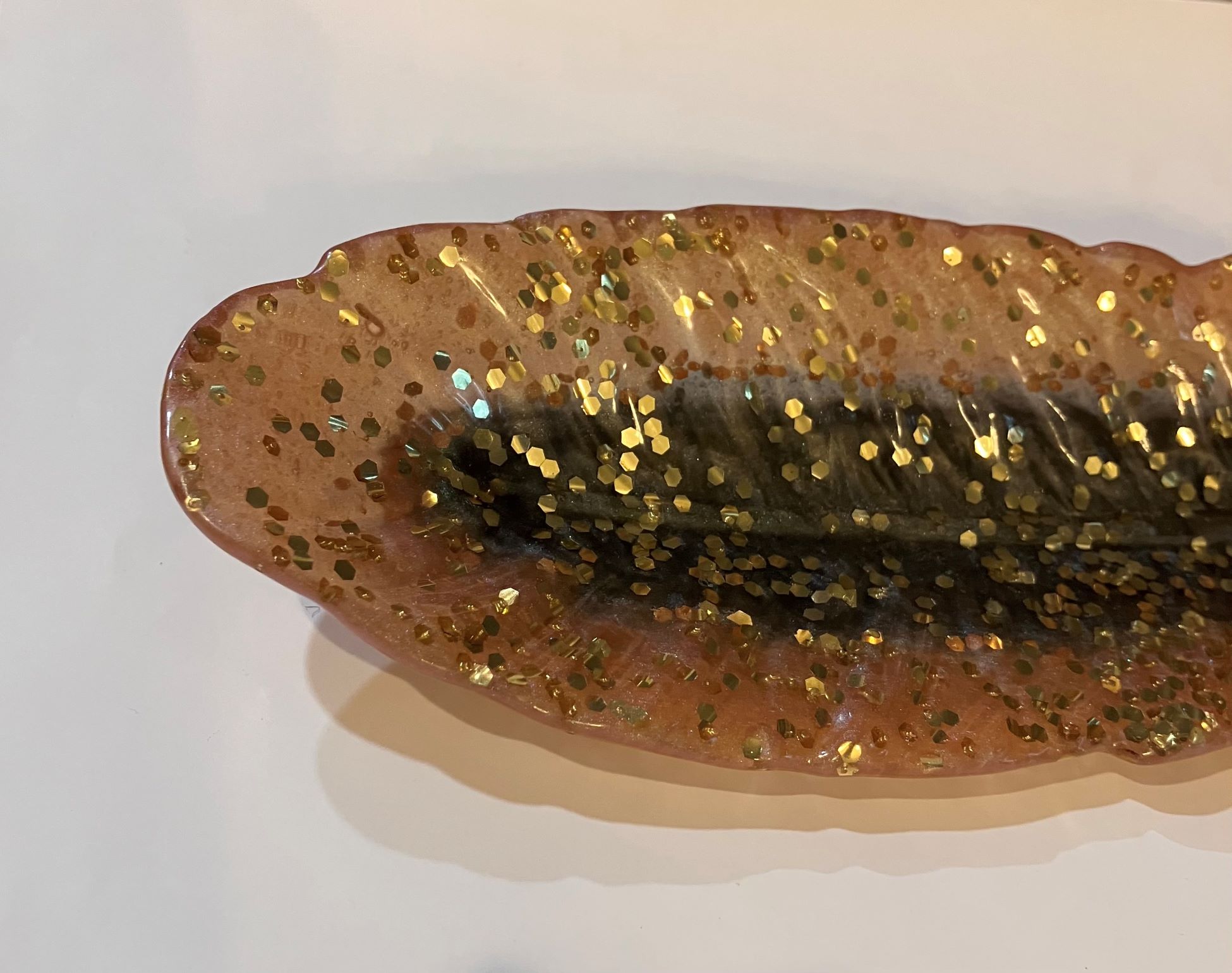 Peachy Chameleon & Dark Gray Resin Feather Jewelry/Candy Dish/Trinket Tray/Spoon Rest, 1OAKG