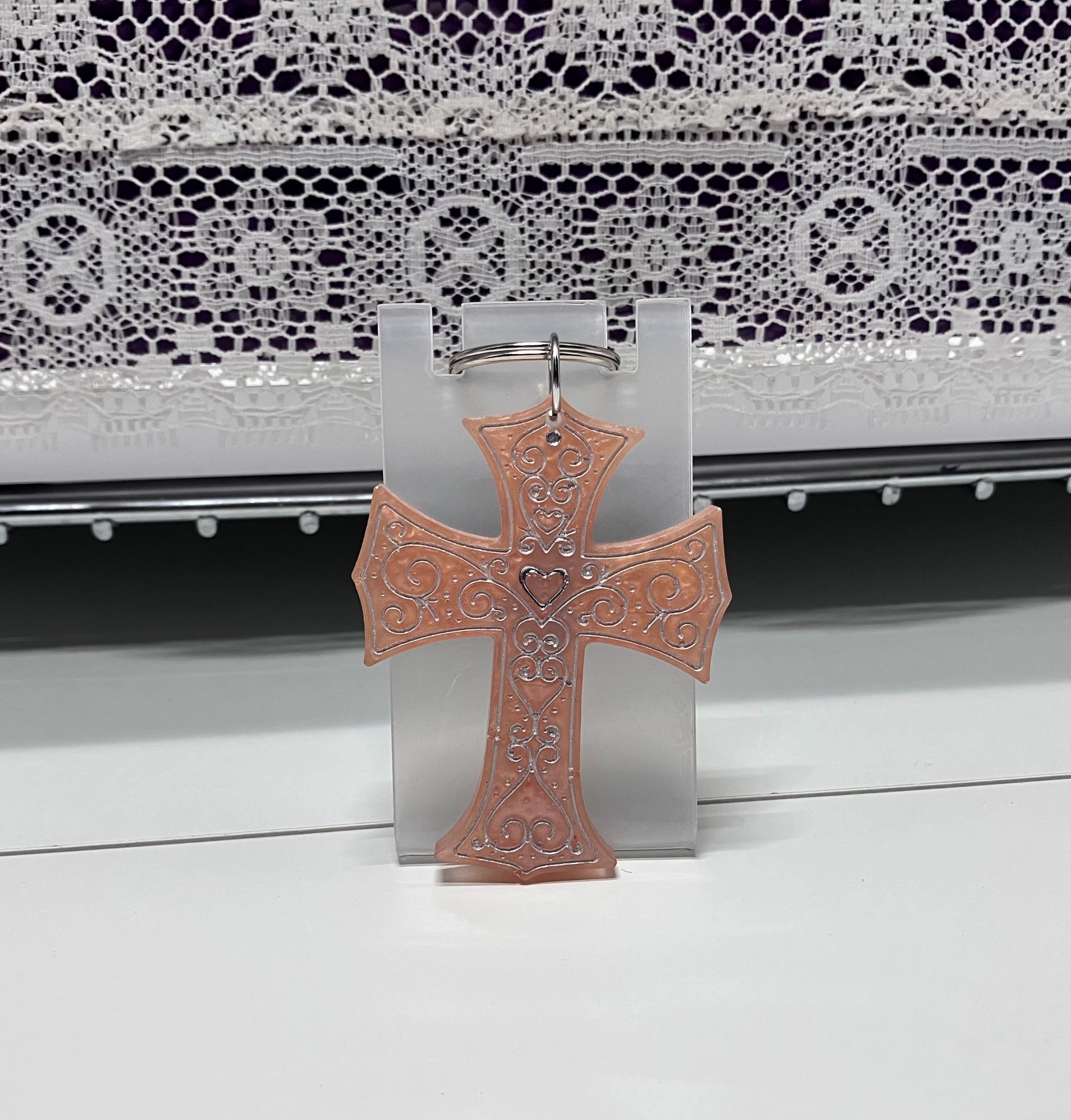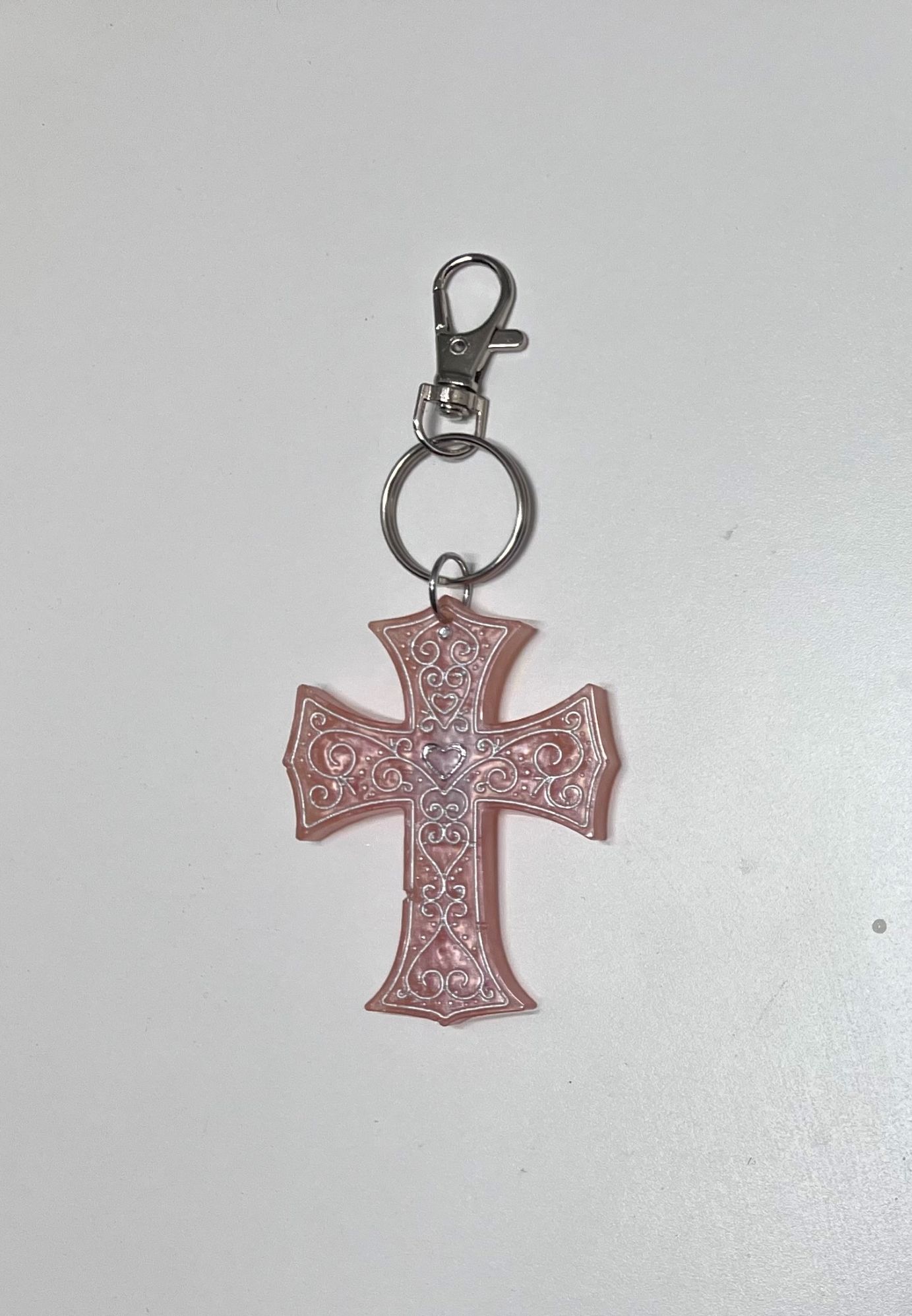 Pinky Peach Resin Embossed Cross Keychain, 1OAKG