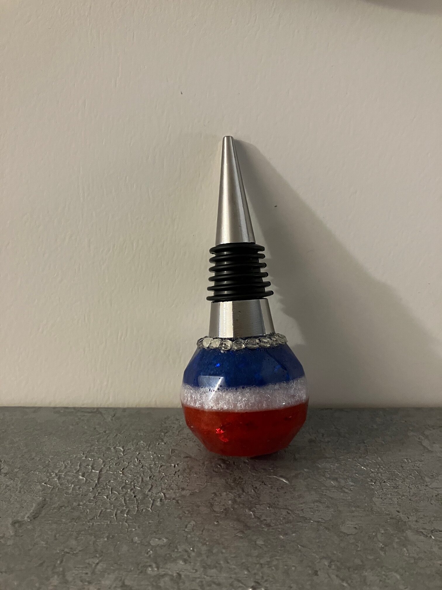 Red, White & Blue Wine Bottle stopper is made with resin. Add to your wine stopper collection or give as a unique gift to someone special.