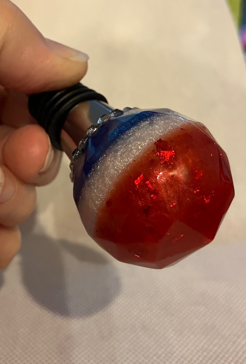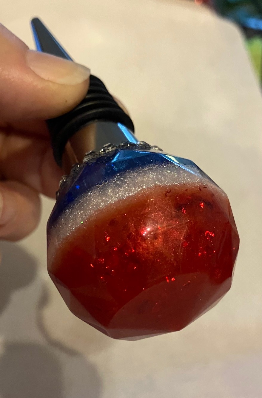 - Materials: Resin, Mica Powder, Foil Flakes, Glitter, Rhinestones, Stainless Steel Wine Stopper