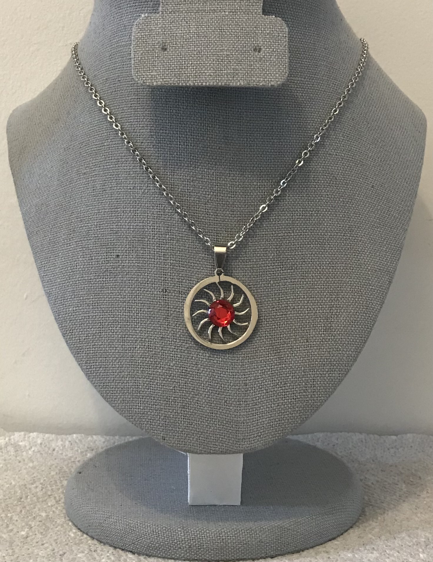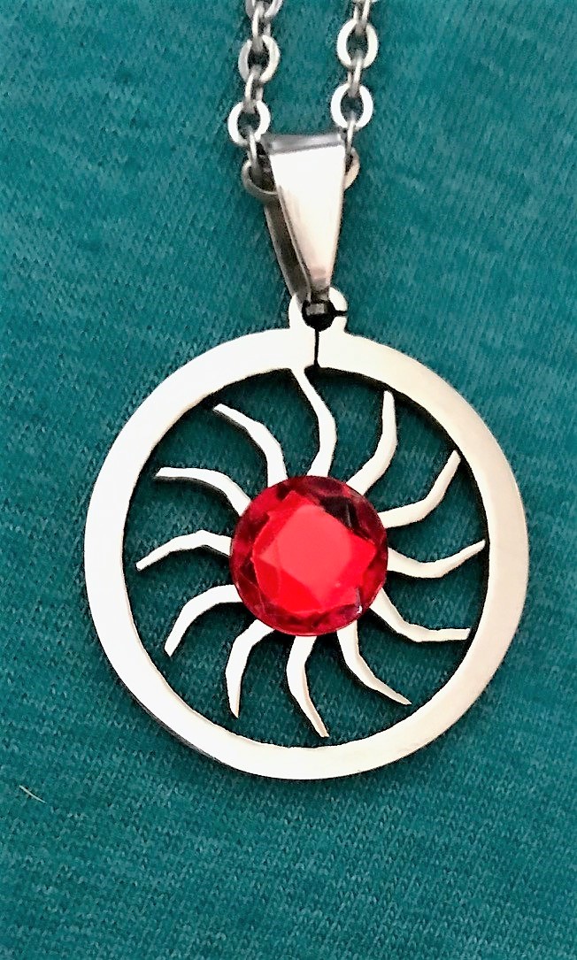 Ruby Red Rhinestone Sun Pendant on a Silver Chain Necklace
