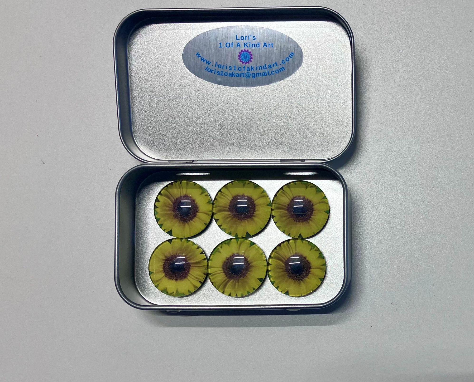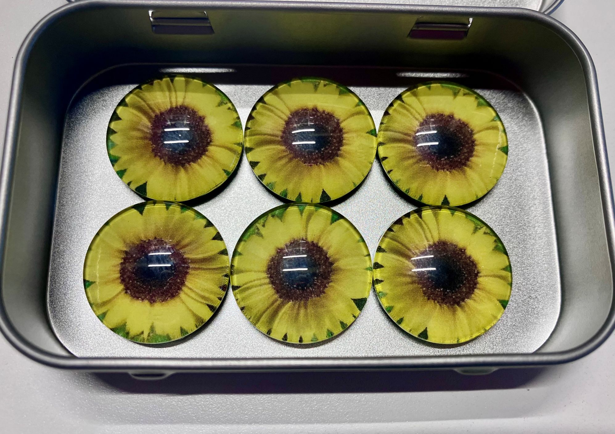 This item is a set of 6 refrigerator magnets. They are 1 inch (25mm) in diameter. They’re very strong magnets. One of these magnets will easily hold several sheets of paper by itself. They’re a perfect unique gift for anyone or just for yourself!