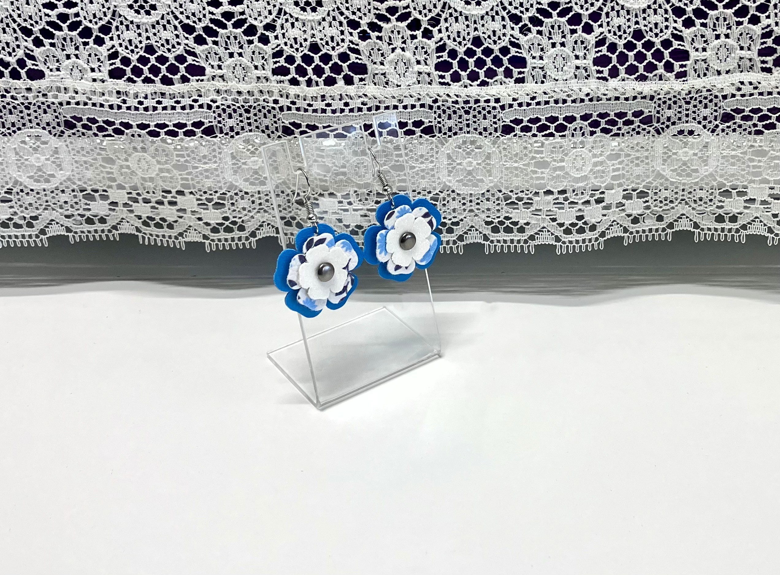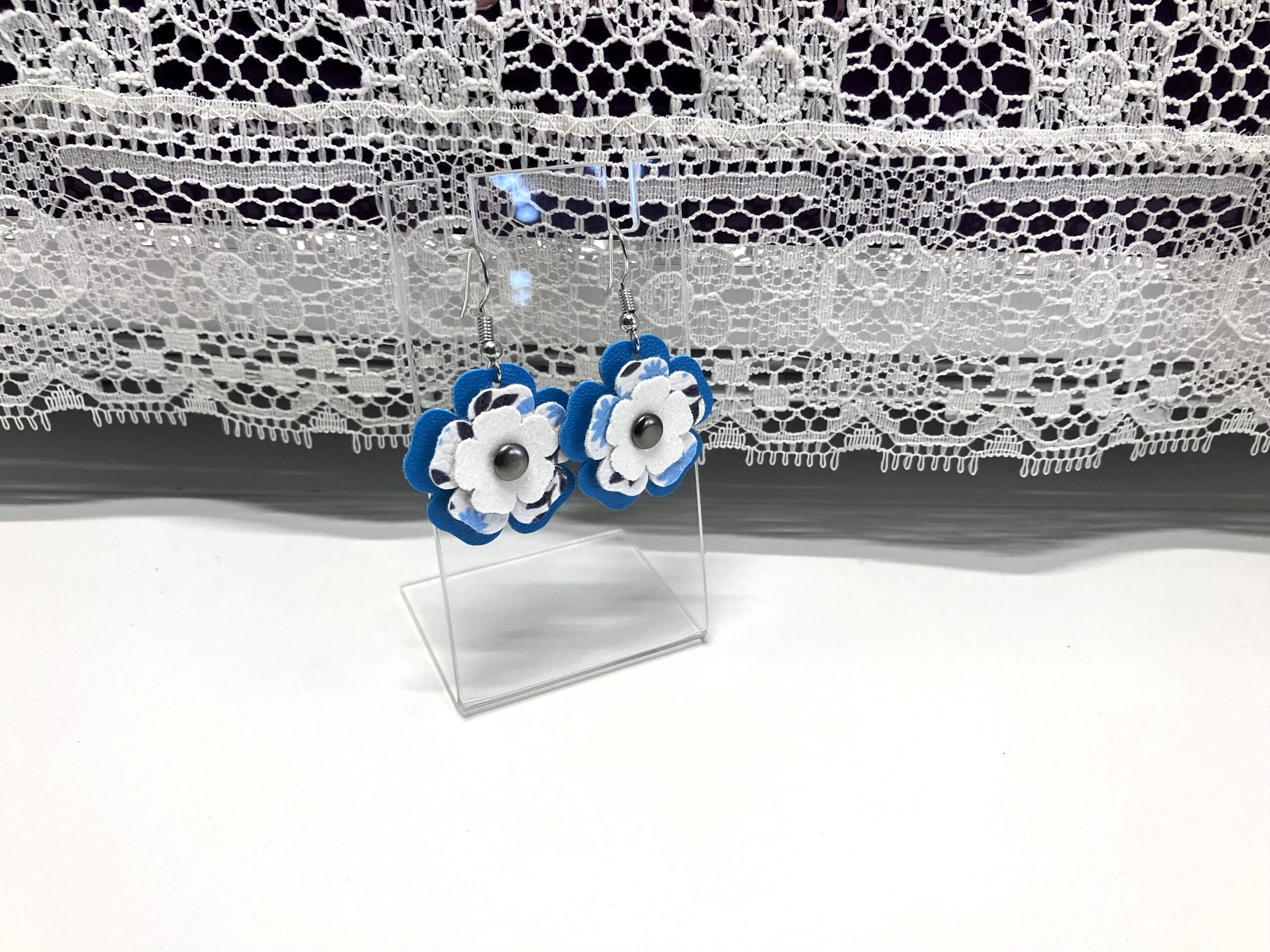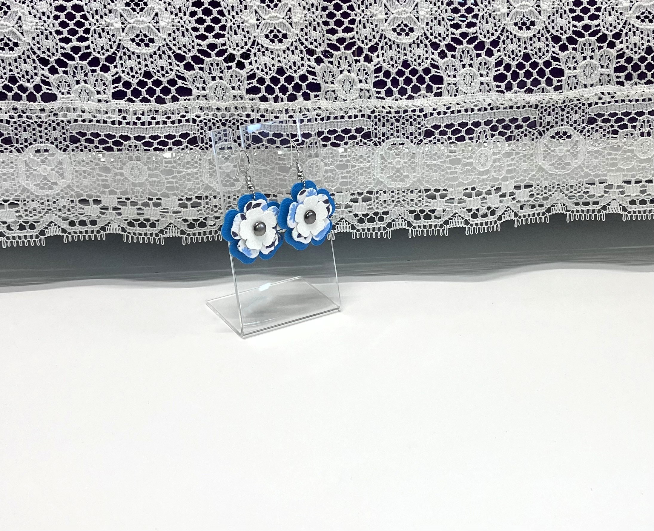 Teal and Glitter White Triple-Layered Flower Dangle Earrings, 1OAKG