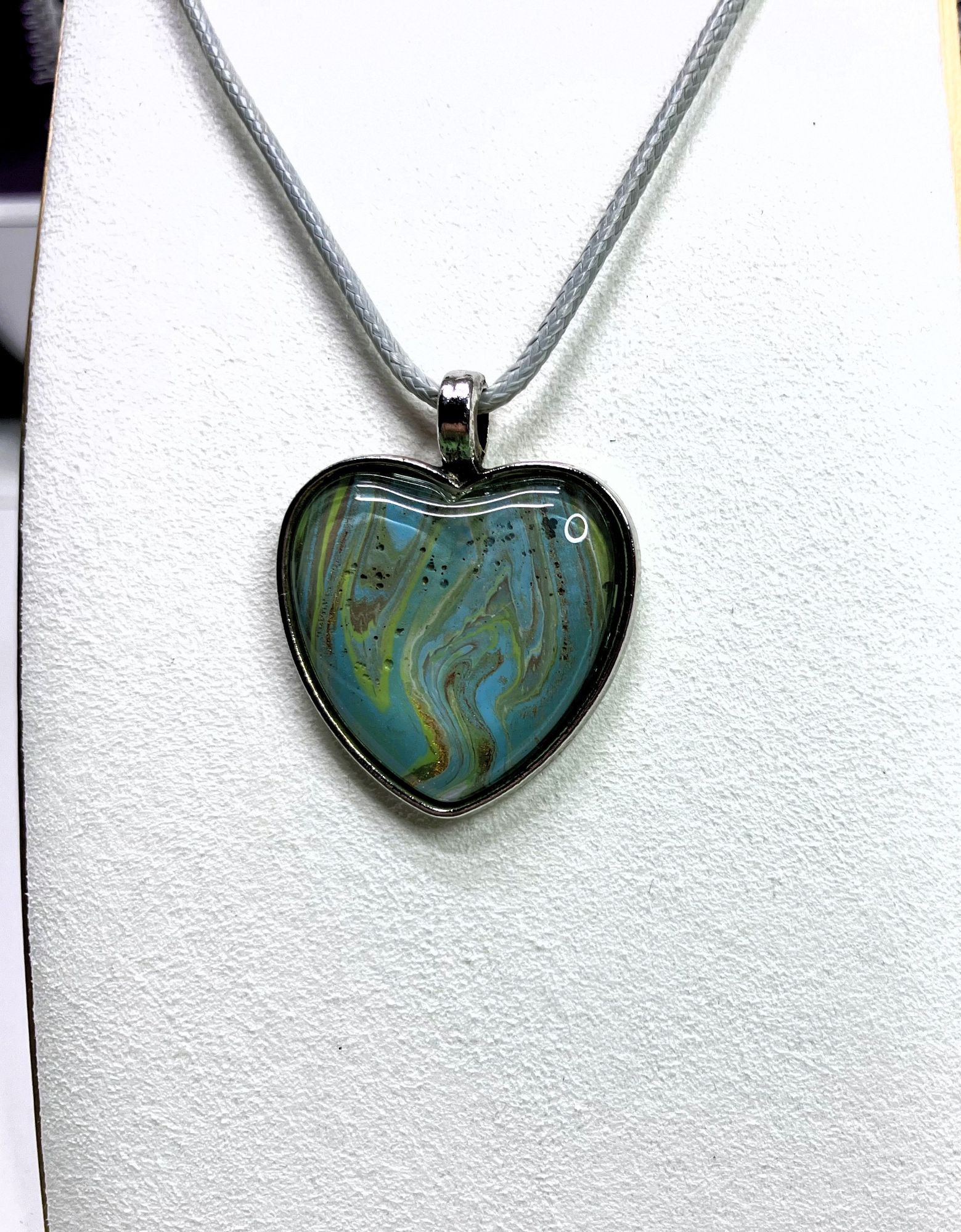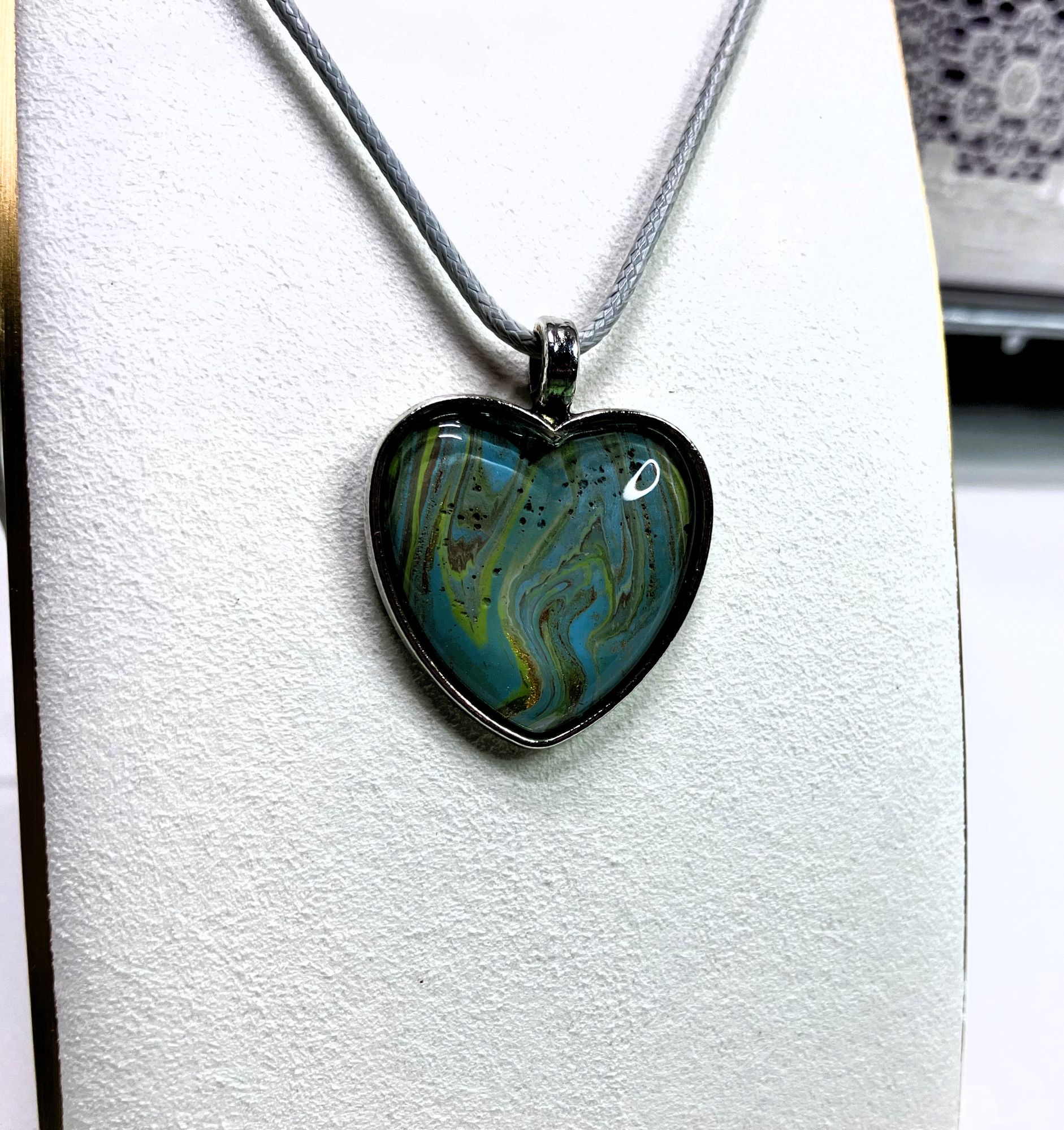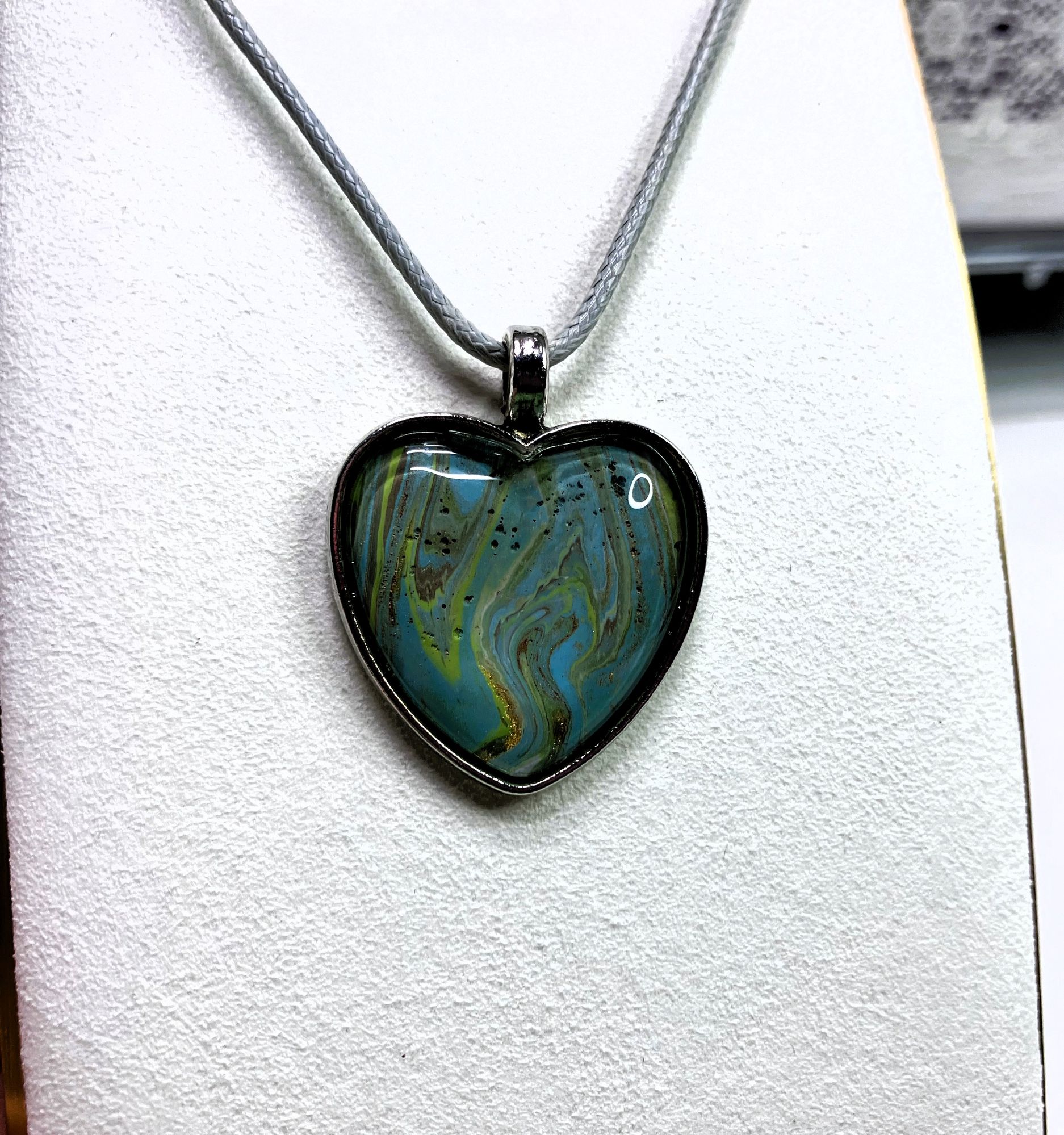 Express your unique style with this one-of-a-kind pendant necklace. The pendant features a heart shape with stunning fluid art in assortment of colors. It comes with an 18″ matching cord with a 2″ extension and a lobster clasp closure for a secure fit. The pendant necklace is made of surgical steel and silver. This necklace is handmade and perfect for those who love art-inspired jewelry.