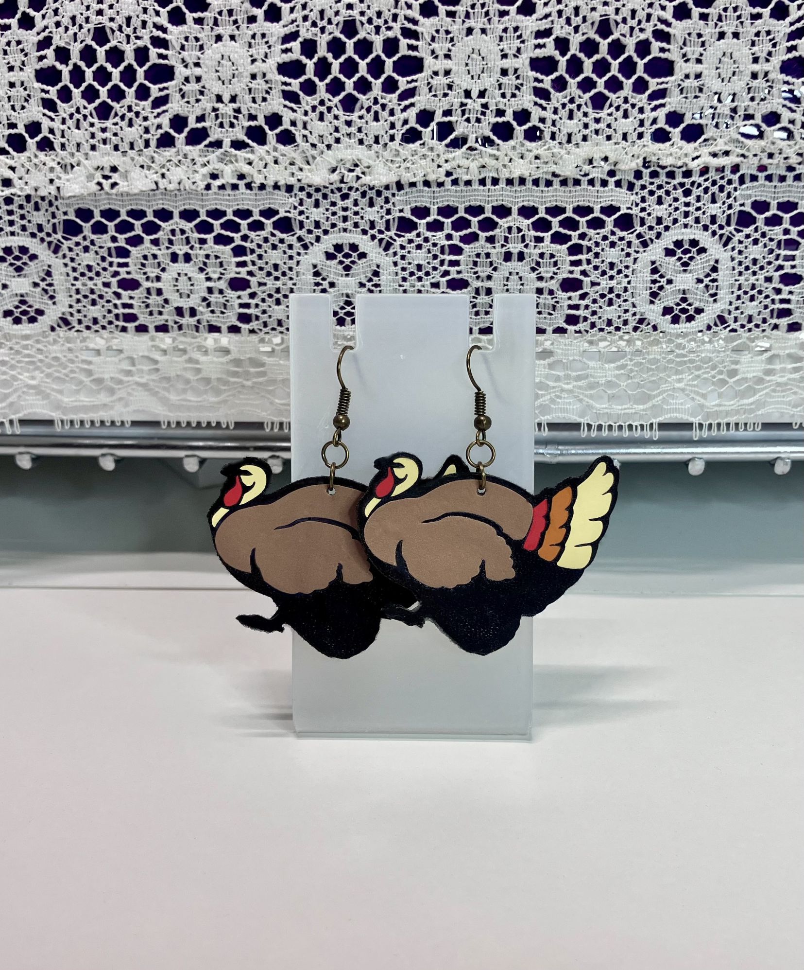 Create a festive statement with these beautiful, handmade and super lightweight earrings. The earrings feature a single-layer design with the front and backside of faux leather with 5 colors of HTV, which makes them a much sturdier feel. These dark fish hook dangle earrings are lightweight making them comfortable to wear all day long and would go perfectly with your Thanksgiving attire. They are approximately 2” long by 1.75” wide. This pair of earrings would be a great addition to your holiday jewelry collection.