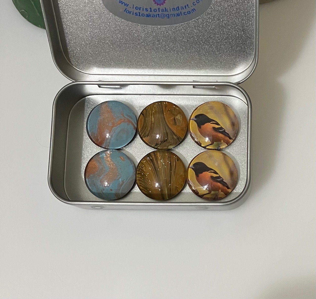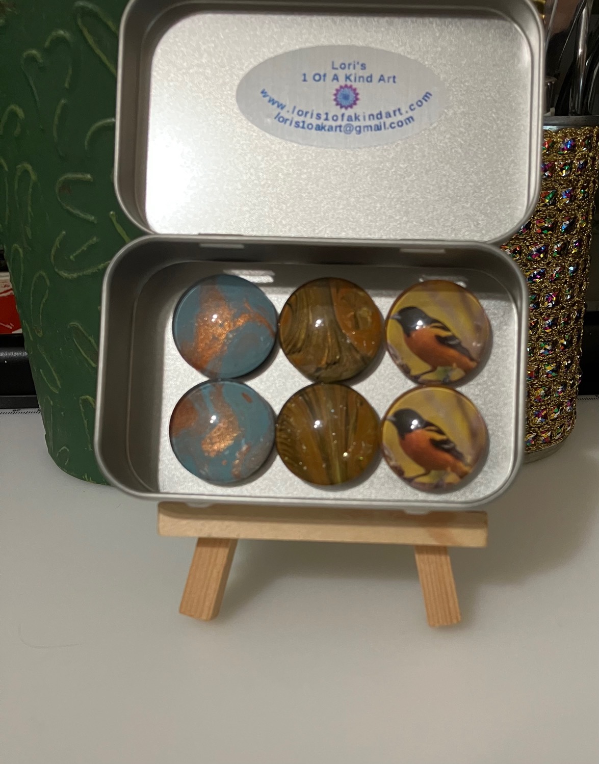 This item is a set of 4 acrylic pour and 2 pho art refrigerator magnets. They are 1 inch (25mm) in diameter. They’re very strong magnets. One of these magnets will easily hold several sheets of paper by itself. They’re a perfect unique gift for anyone or just for yourself as they are all one of a kind pieces of art!