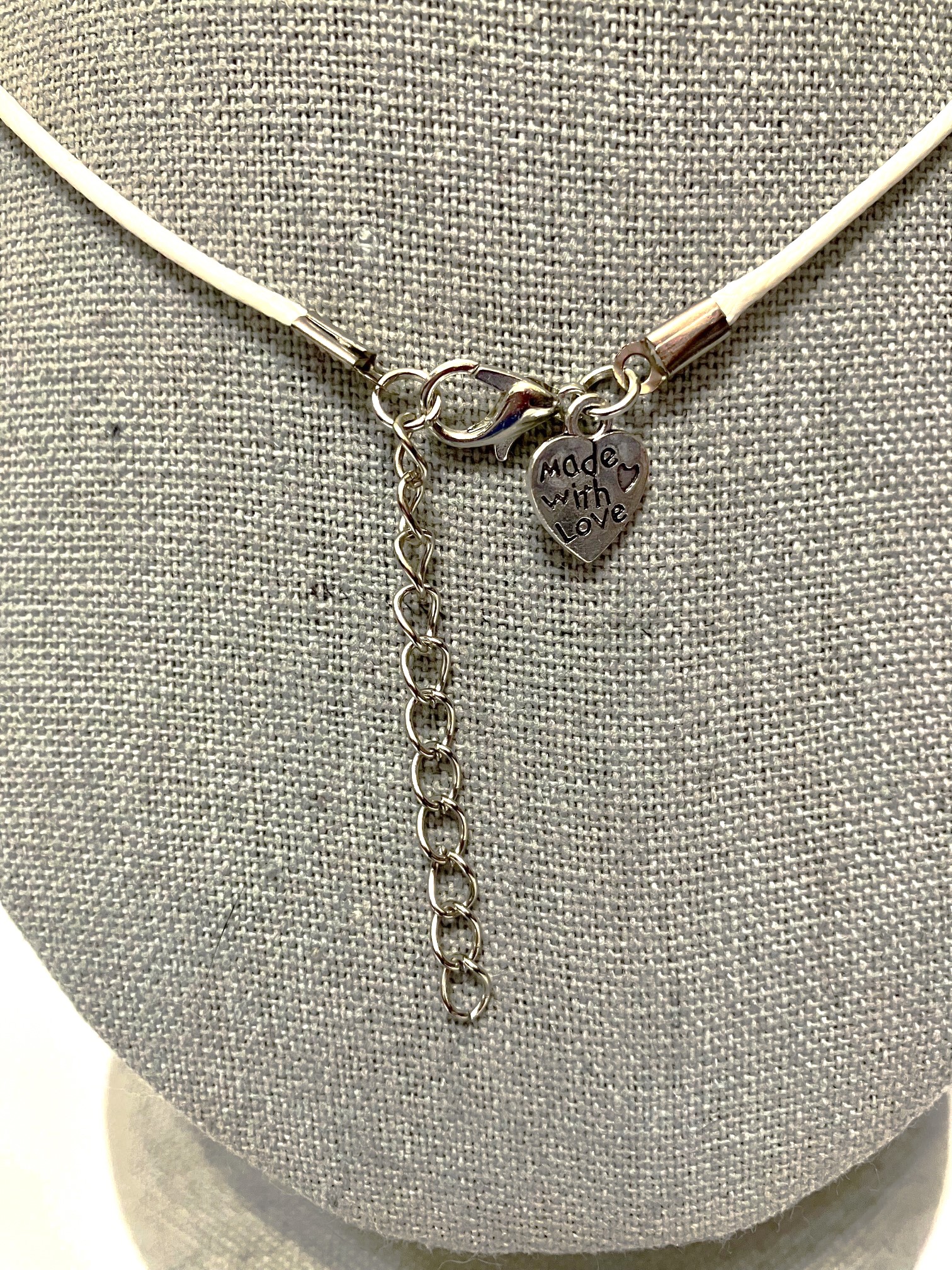 A lovely necklace with a turquoise gemstone spike pendant is hanging on a white cord necklace.