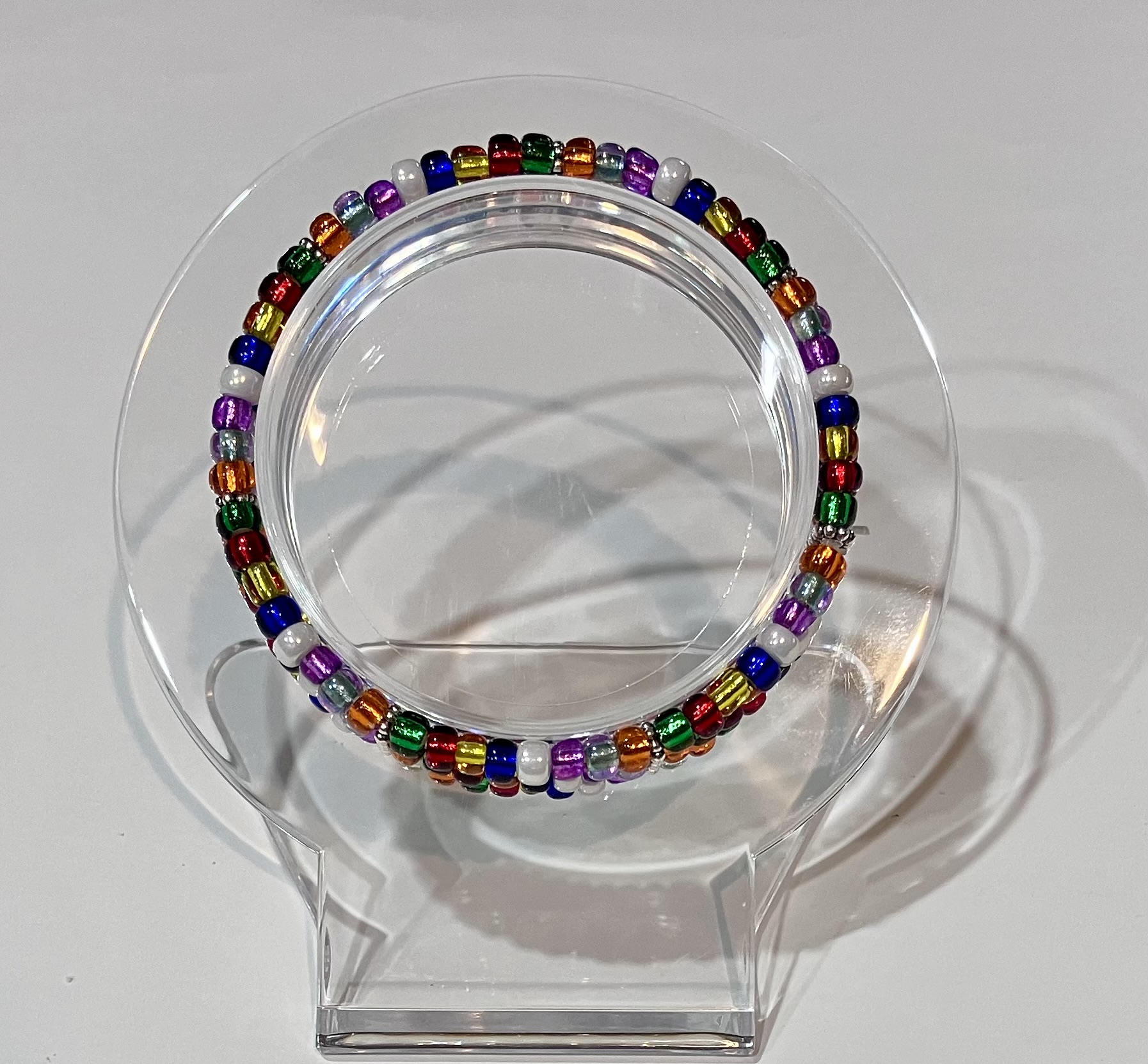 - Materials: Â glass beads & strong doubled stretchy cord