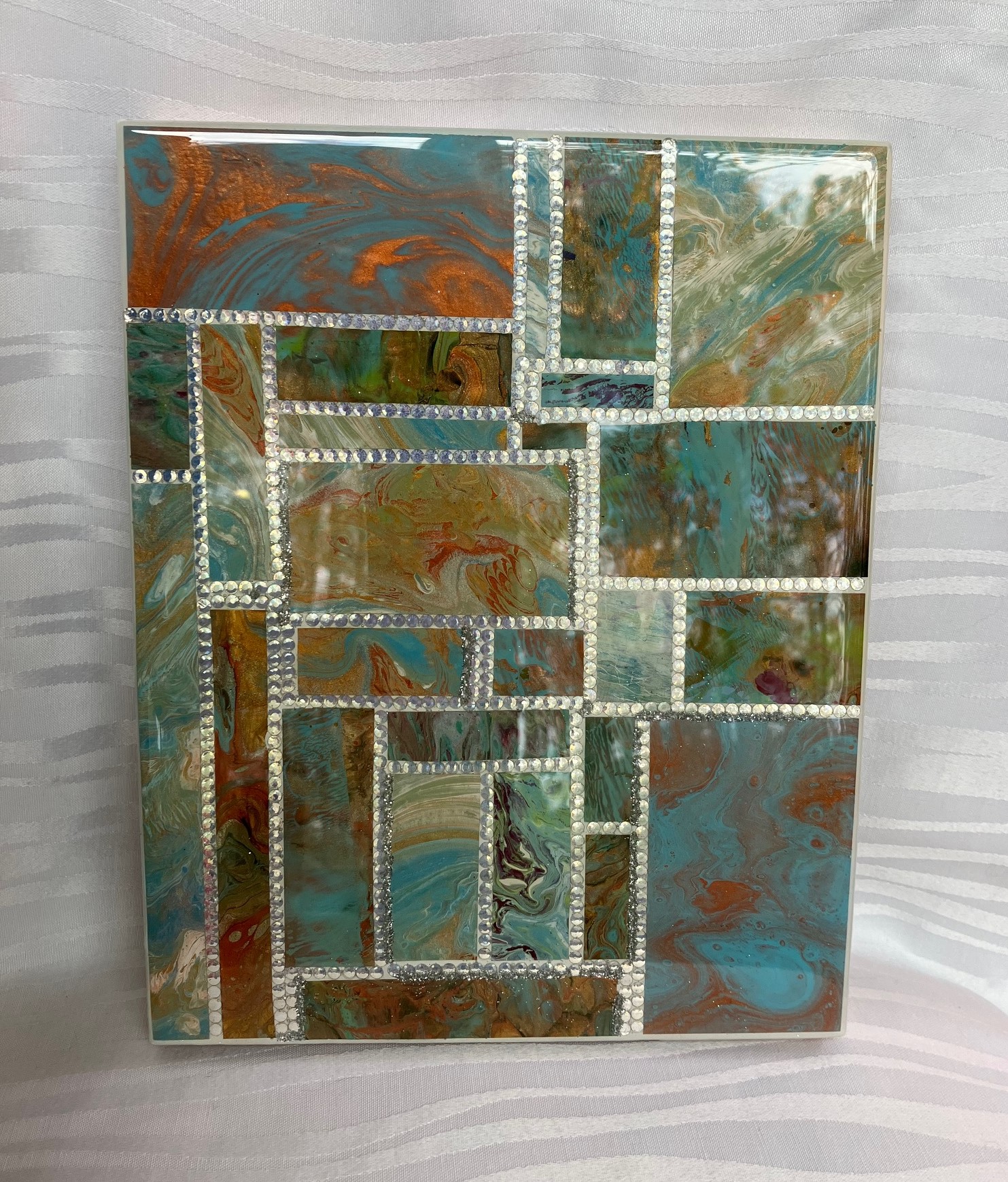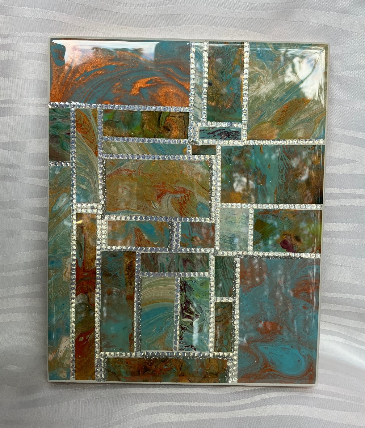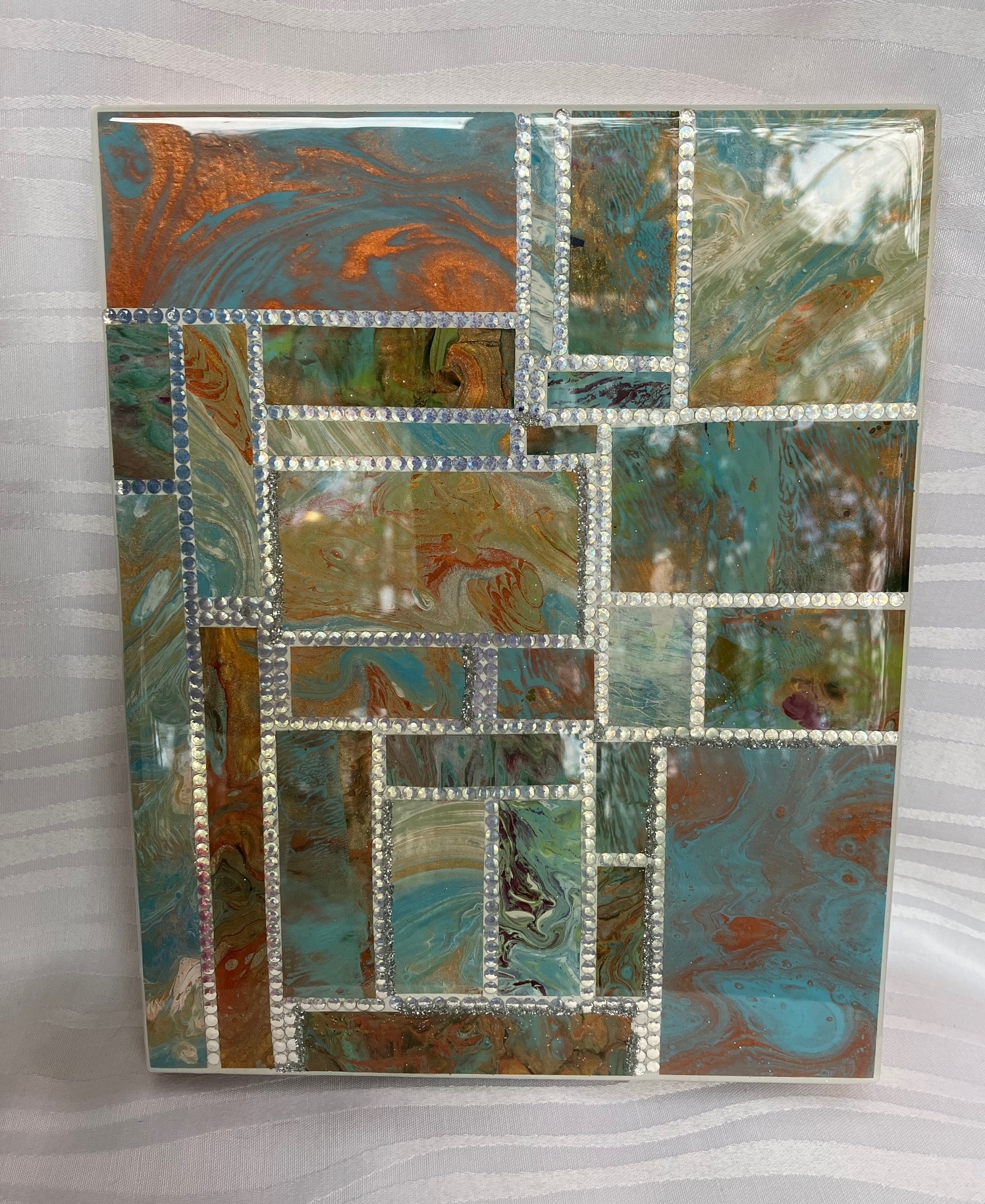 The white diamond rhinestone stitch-work on this painting are just one size. The patchwork are ultimately smaller versions of my full size paintings!  Many hours of putting them on after putting the acrylic skins on it. I hope everyone understands how much time I put into this rewarding and fun project.