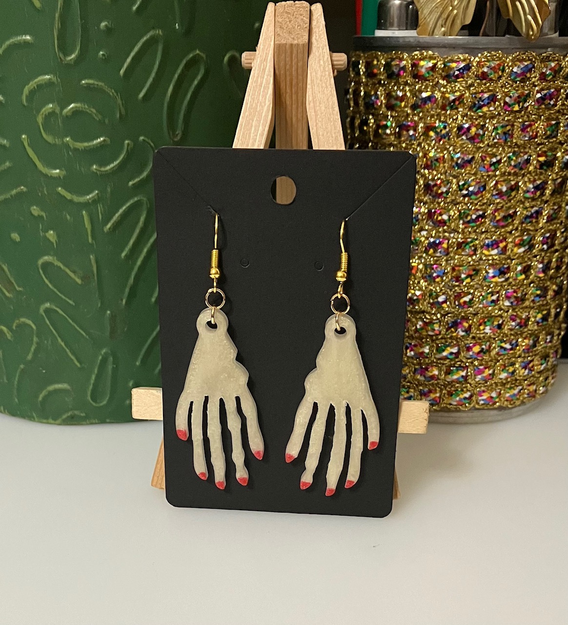 Elevate your Halloween jewelry collection with these exquisite white mica in resin with red nail accents dangle earrings. These unique earrings are perfect for a Halloween festival or house party. The French Wire hook with an added silicone backing keeps the earrings securely in place, while the 2.75-inch length by 1-inch width makes them an ideal statement piece. The white skeletal hands with red fingernails adds a touch of creepiness to your Halloween outfit. These earrings are perfect for anyone who loves artisanal and handcrafted jewelry.