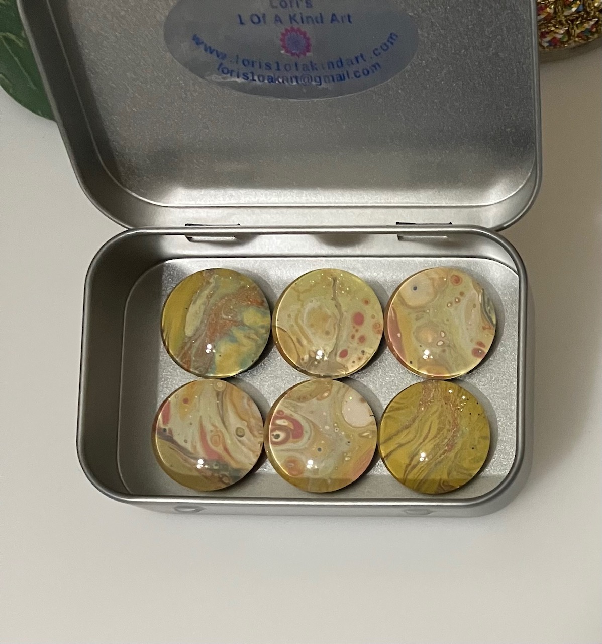 This item is a set of 6 acrylic pour refrigerator magnets. They are 1 inch (25mm) in diameter. They’re very strong magnets. One of these magnets will easily hold several sheets of paper by itself. They’re a perfect unique gift for anyone in your life or for yourself as they are all one of a kind pieces of art!  I make these magnets from the dried paint off of my acrylic pour paintings so the colors will be an assortment and they are stunning in person. The photos don’t do them any justice.